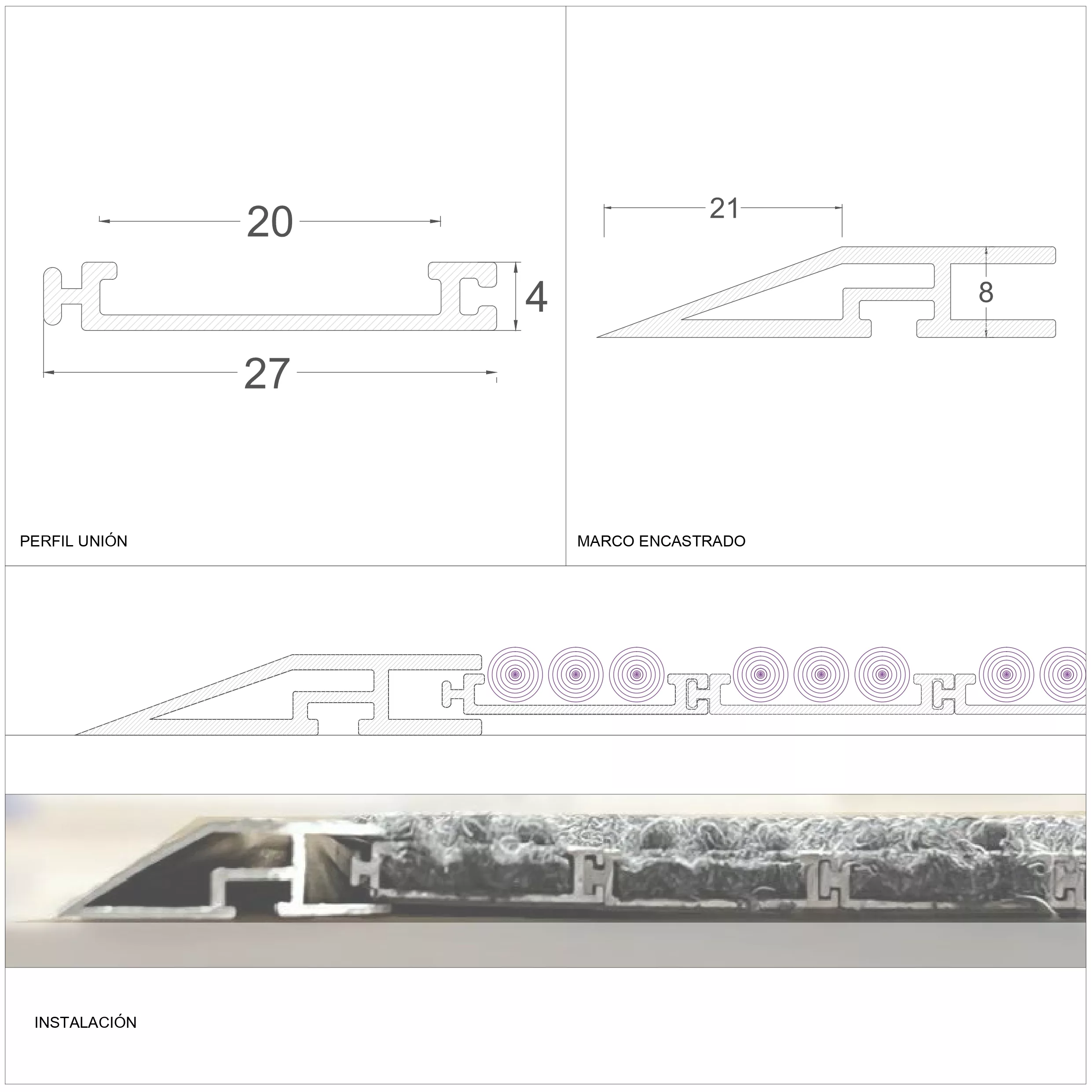 · Perfiles de aluminio y moqueta gris.