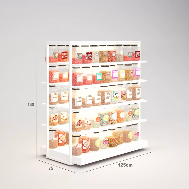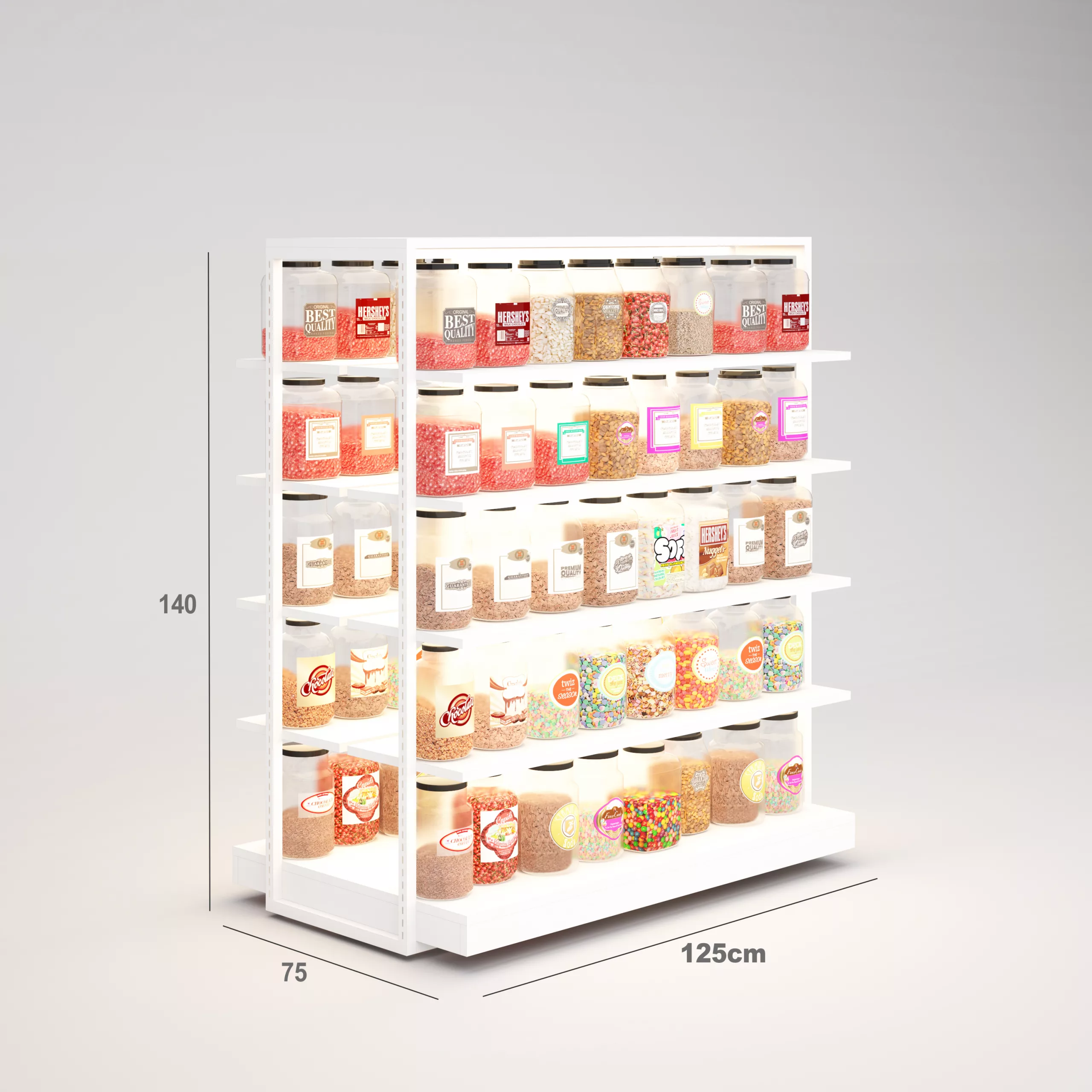 Alimentación Góndola SQ, estantes de madera con iluminación led, fondo liso y tarima (Tubo Cuadrado25mm)