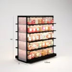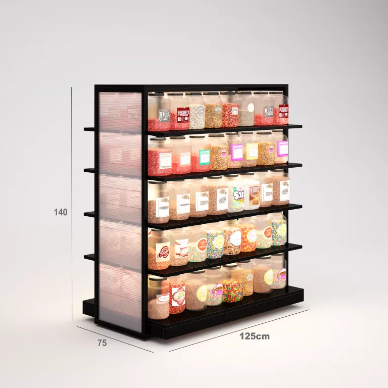 Alimentación Góndola SQ, estantes de madera con iluminación led, fondo policarbonato y tarima (Tubo Cuadrado25mm)