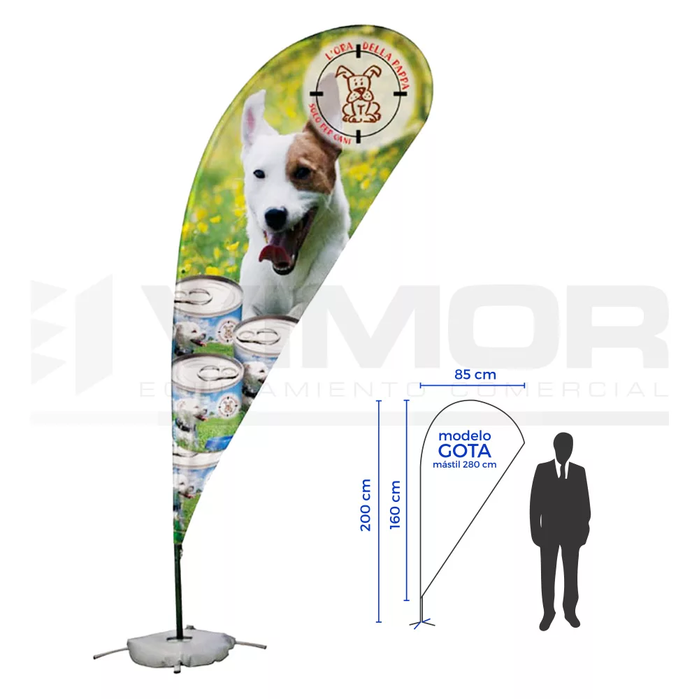 Bandera modelo GOTA tamaño S . Incluye Textil flag (bandera) impresión por sublimación. Base aspa y bolsa de transporte incluida. Mástil de fibra de alta calidad.