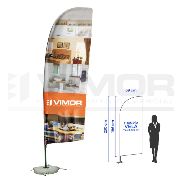 Bandera modelo vela tamaño S. Incluye Textil flag (bandera) impresión por sublimación.  Base aspa y bolsa de transporte incluida. Mástil de fibra de alta calidad.