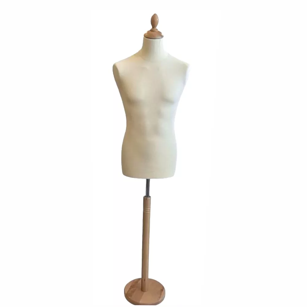Busto de porexpan caballero con funda color crema. Incluye tapa y base de madera. Ideal para poder presentar sus prendas.