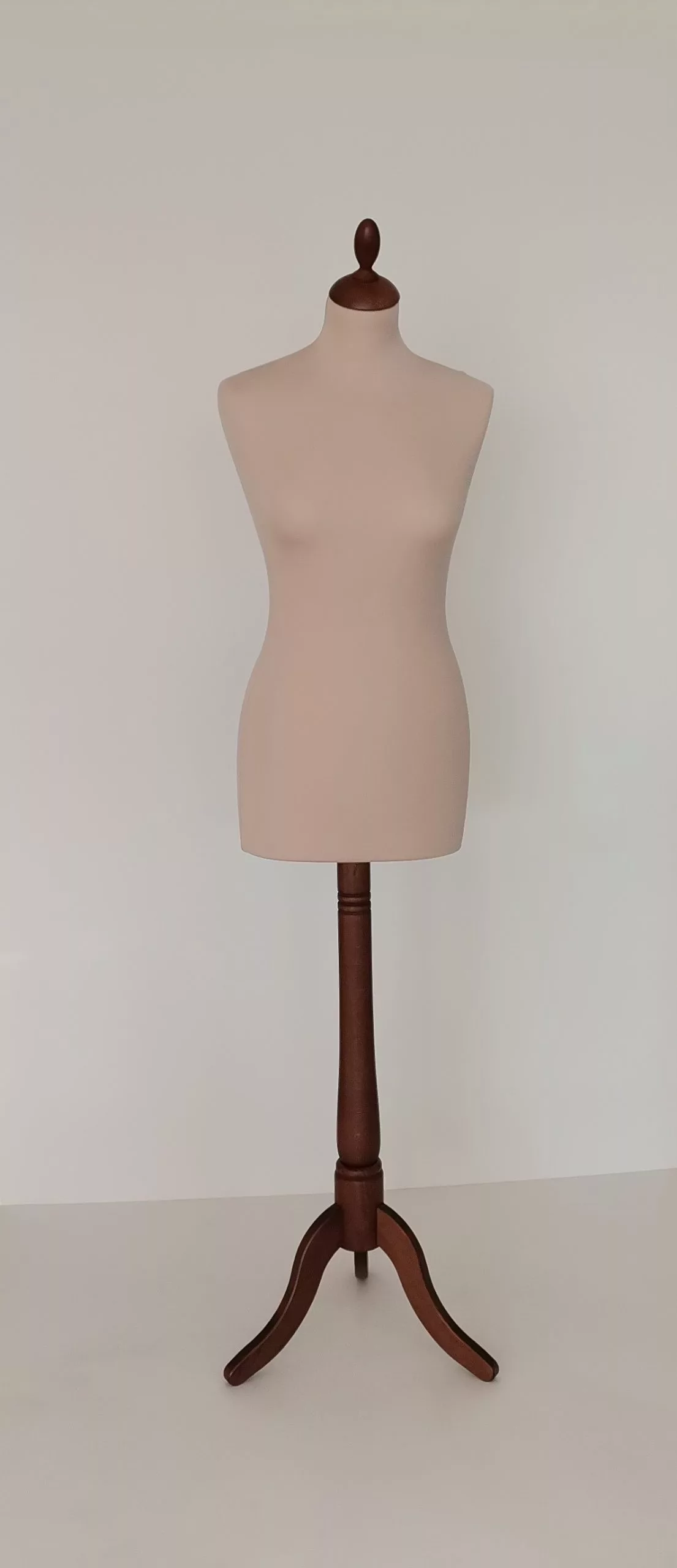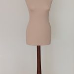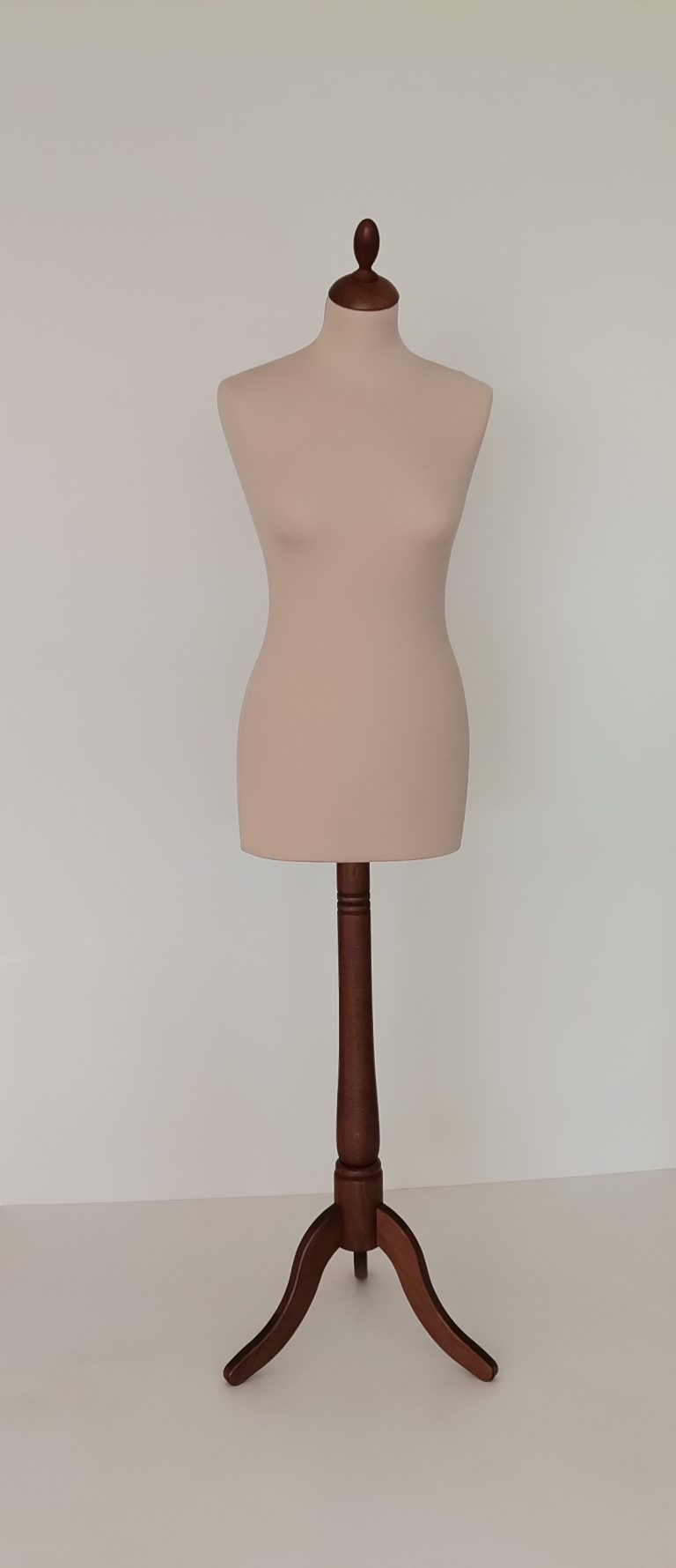 Busto clásico señora de poliestireno, con base trípode y tape en color acacia y funda en color beige oscuro.