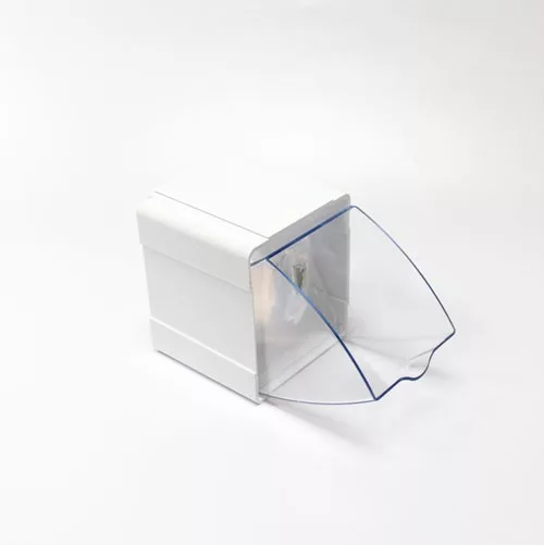 Caja con cajón. Exterior color blanco y puerta en color transparente.