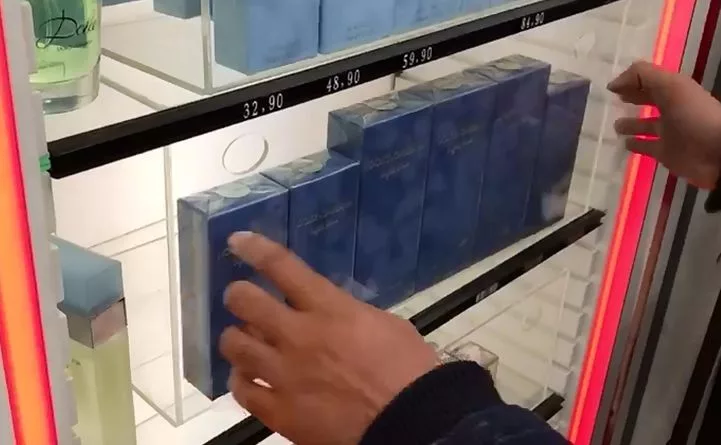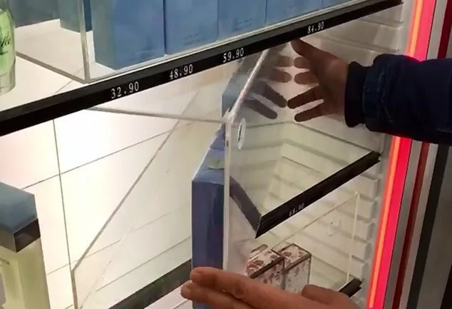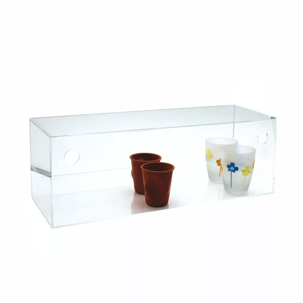 Caja display protectora de productos en estanterías. Color transparente.