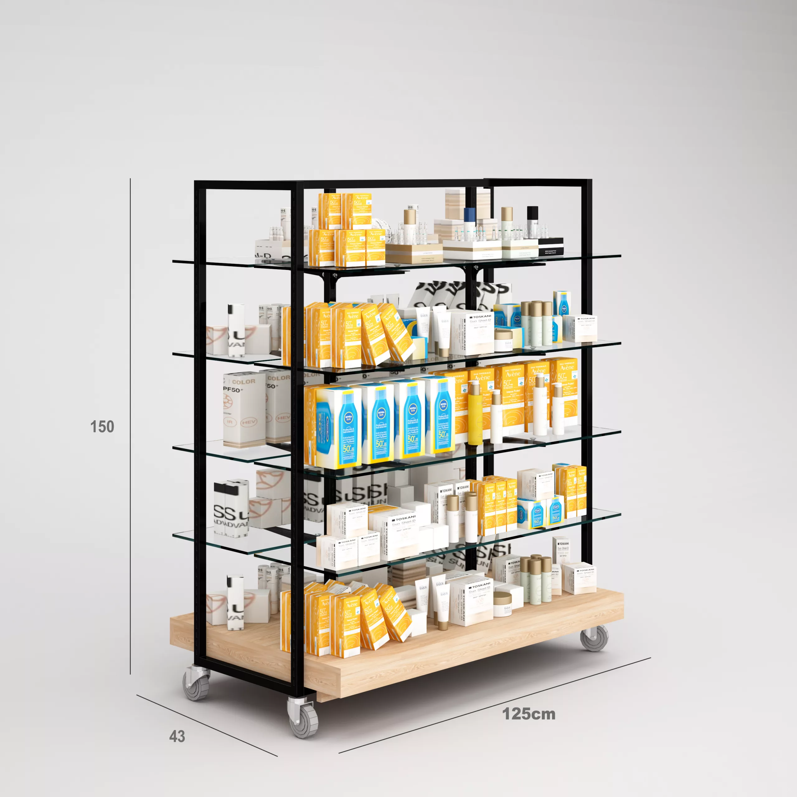 Cremas Solares/Aloe Vera Góndola Terraza SQ, estantes de cristal y Tarima (Tubo Cuadrado25mm)
