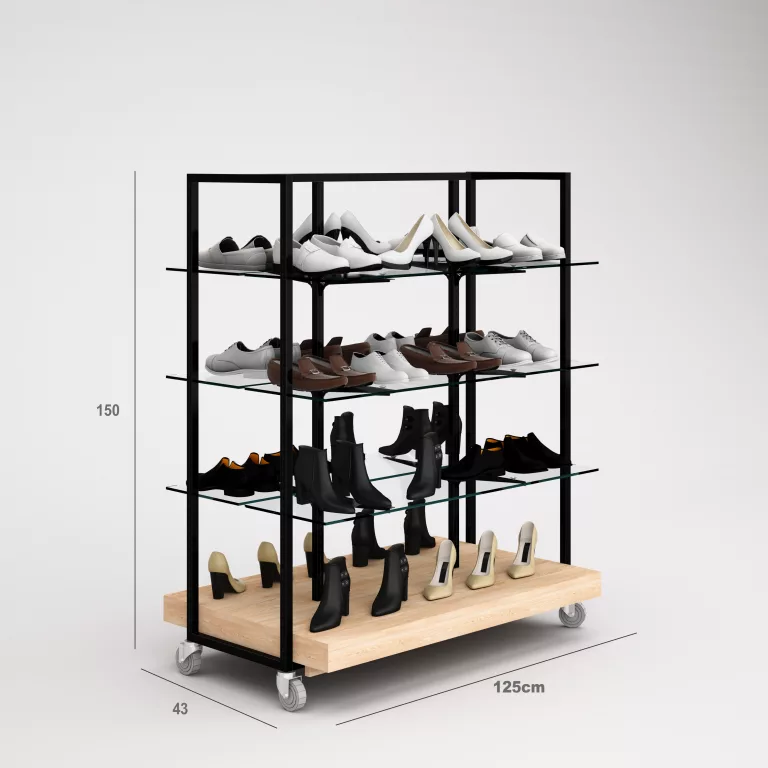 Calzado Góndola Terraza SQ, estantes de cristal y Tarima (Tubo Cuadrado25mm)