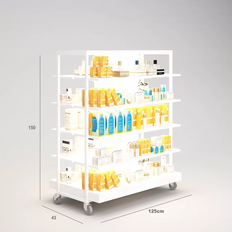 Cremas Solares/Aloe Vera Góndola Terraza SQ, estantes de madera con iluminación, fondo liso y Tarima (Tubo Cuadrado25mm)