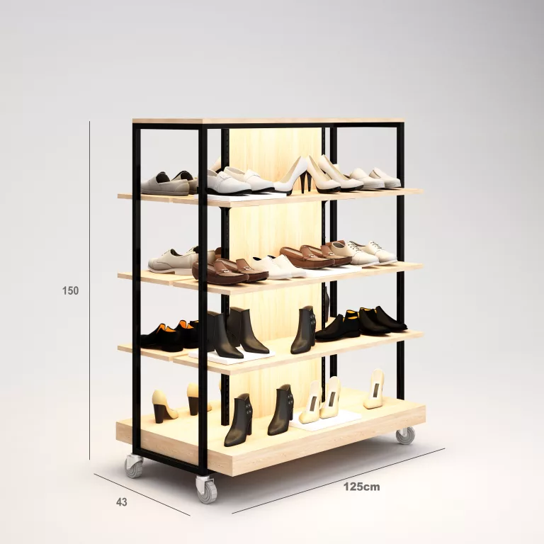 Calzado Góndola Terraza SQ, estantes de madera con iluminación led, fondo liso y Tarima (Tubo Cuadrado25mm)