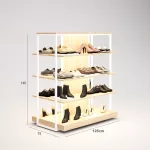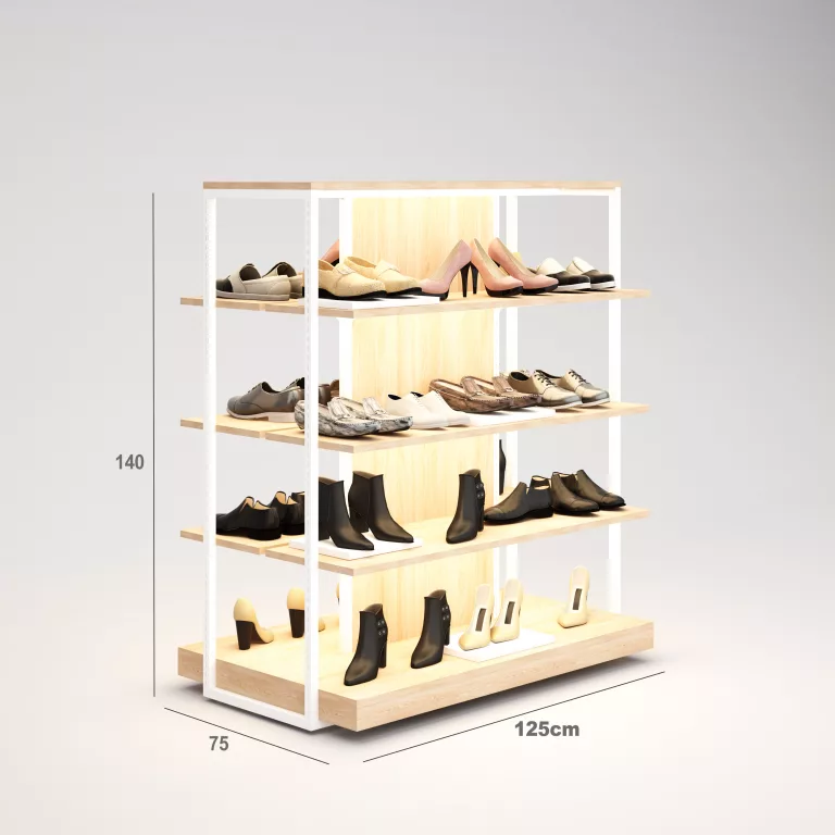 Calzados Góndola SQ, estantes de madera iluminado led, fondo liso y Tarima (Tubo Cuadrado25mm)