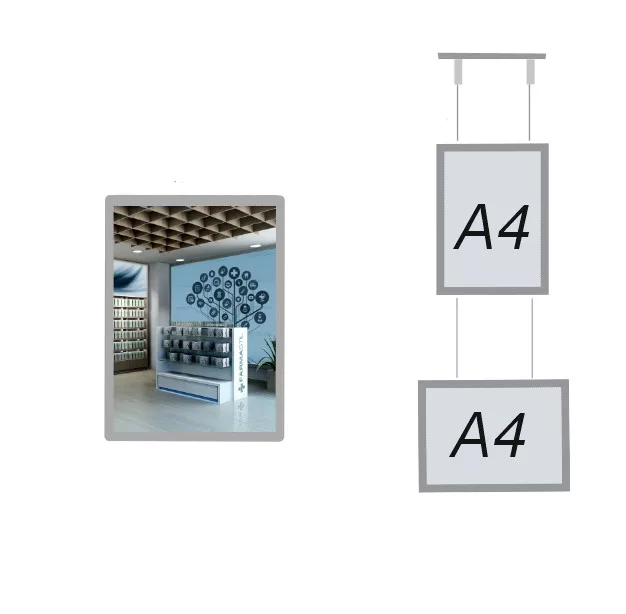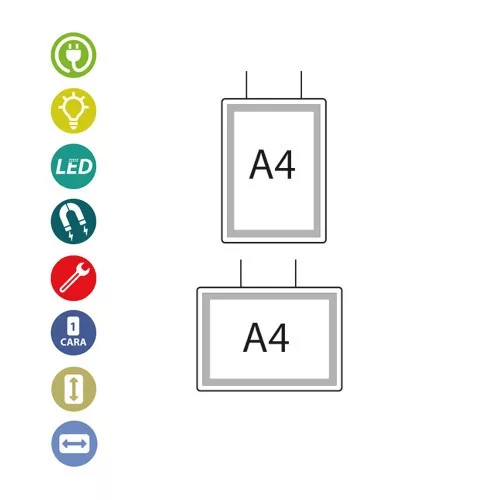 Carpeta led doble cara para sistema carril A4 (249x334x8mm) con apertura magnética. El protector del led (Lens) de 1mm material acrílico, marca Mitsubishi. Panel led (LGP)  de 6mm en material acrílico, marca Mitsubishi. Marco del panel en color plata. Multiposición, se pueden colocar carteles en una misma linea en vertical y horizontal y combinar tamaño A4 y A3