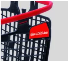Carro de supermercado de plástico. Es compacto, ligero, maniobrable y su diseño optimiza el espacio en tienda. Su versatilidad permite que encaje en cualquier sector. Color negro con asa en rojo.