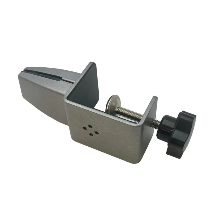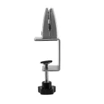 Sistema de pinza giratoria para colocar vidrio o metacrilato de 3mm a 14mm de espesor sin agujerear de hasta 70 cm de altura. Fijación a mesas de entre 12 y 30mm de grosor, se puede instalar como dirección vertical u horizontal