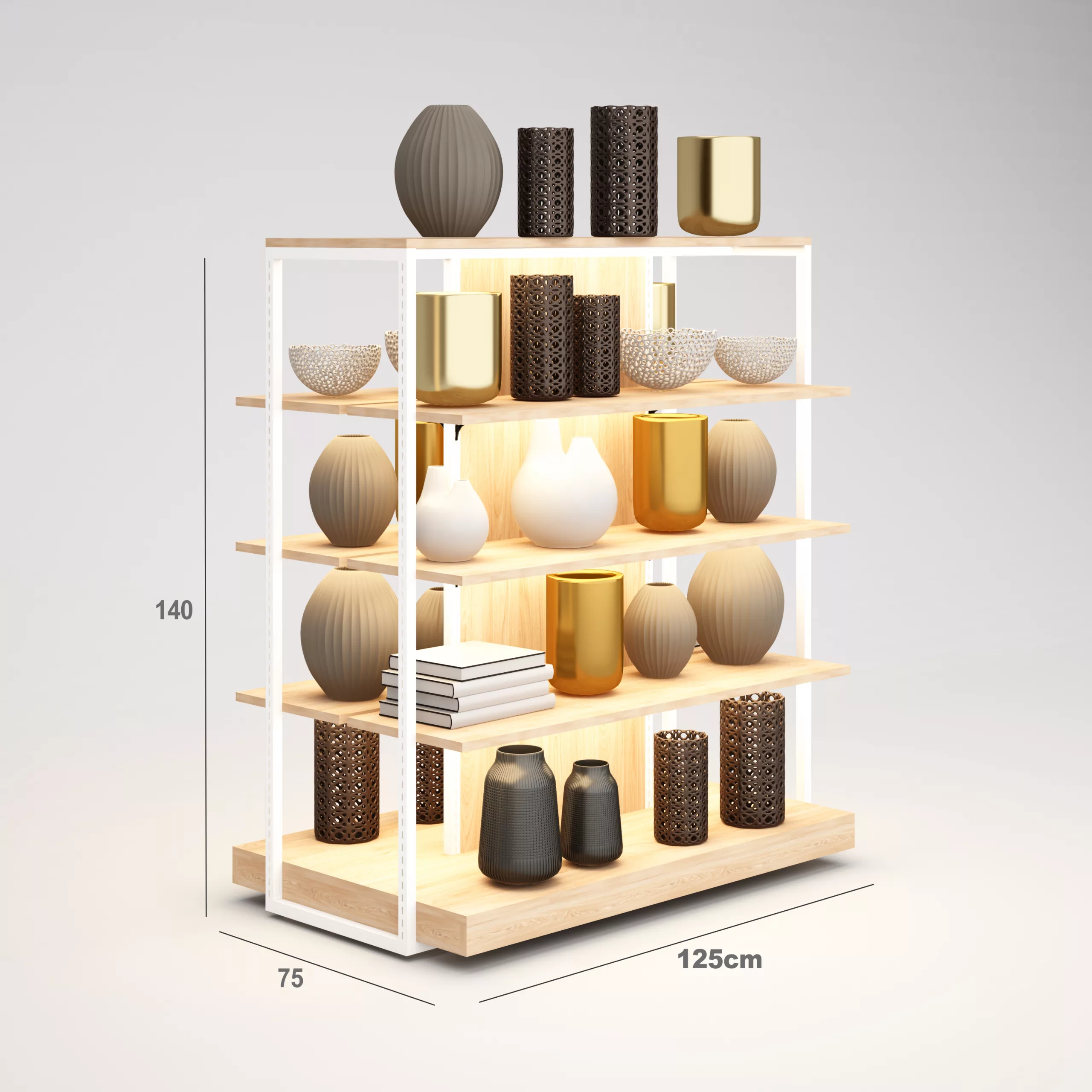 Complementos Góndola SQ, estantes de madera con iluminación led, fondo liso y Tarima (Tubo Cuadrado25mm)
