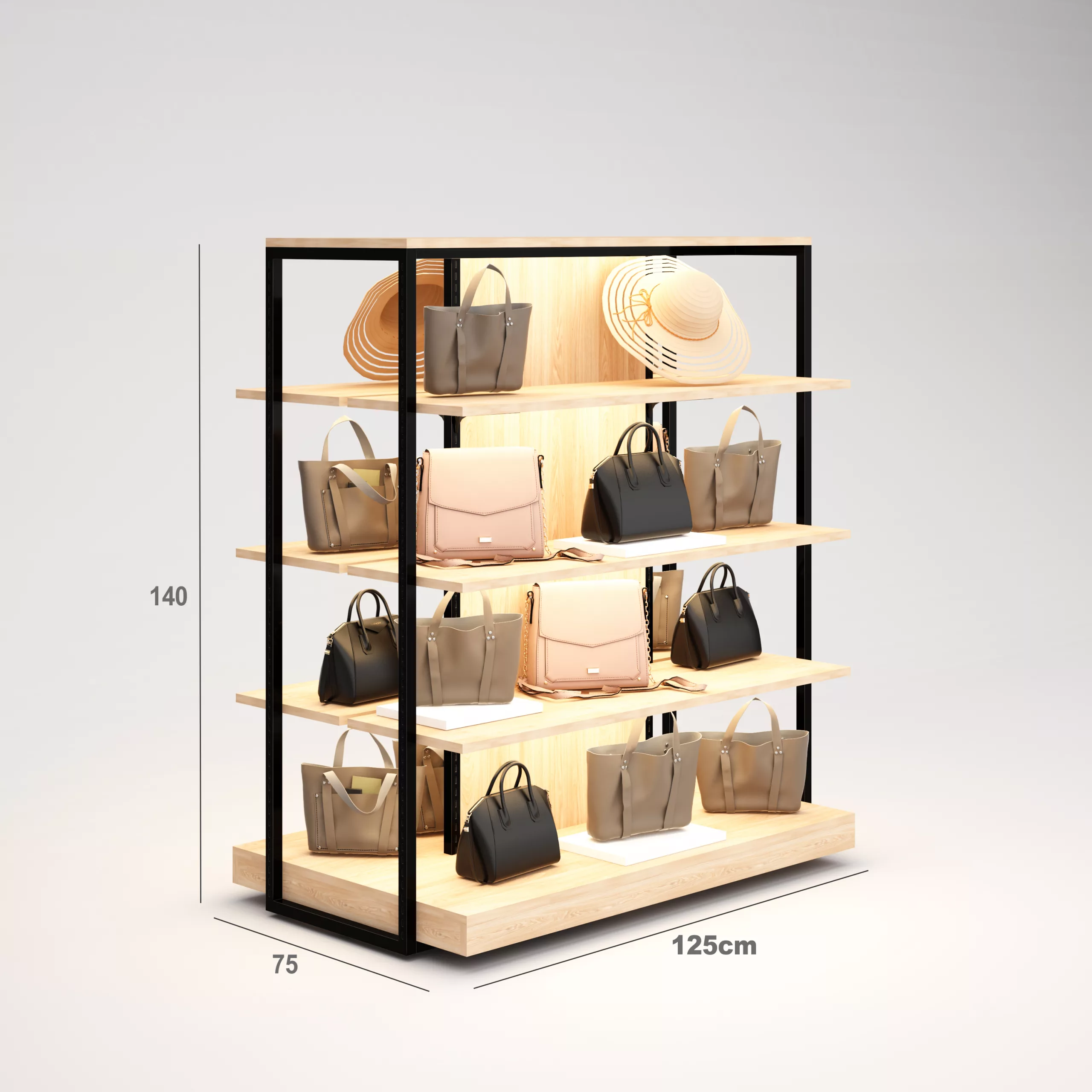Complementos Góndola SQ, estantes de madera con iluminación led, fondo liso y Tarima (Tubo Cuadrado25mm)