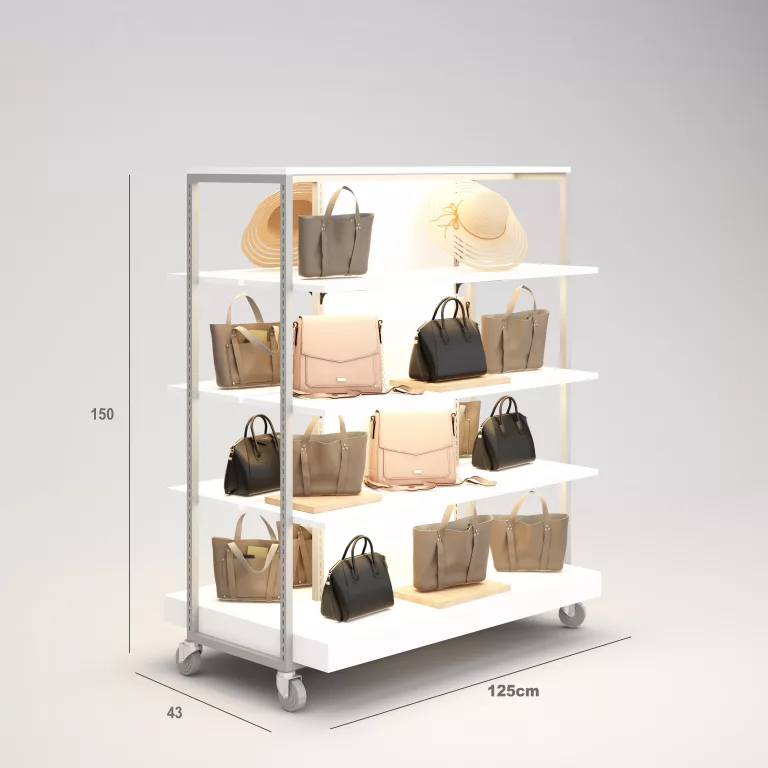 Complementos Góndola Terraza SQ, estantes de madera con iluminación led, fondo liso y Tarima (Tubo Cuadrado25mm)