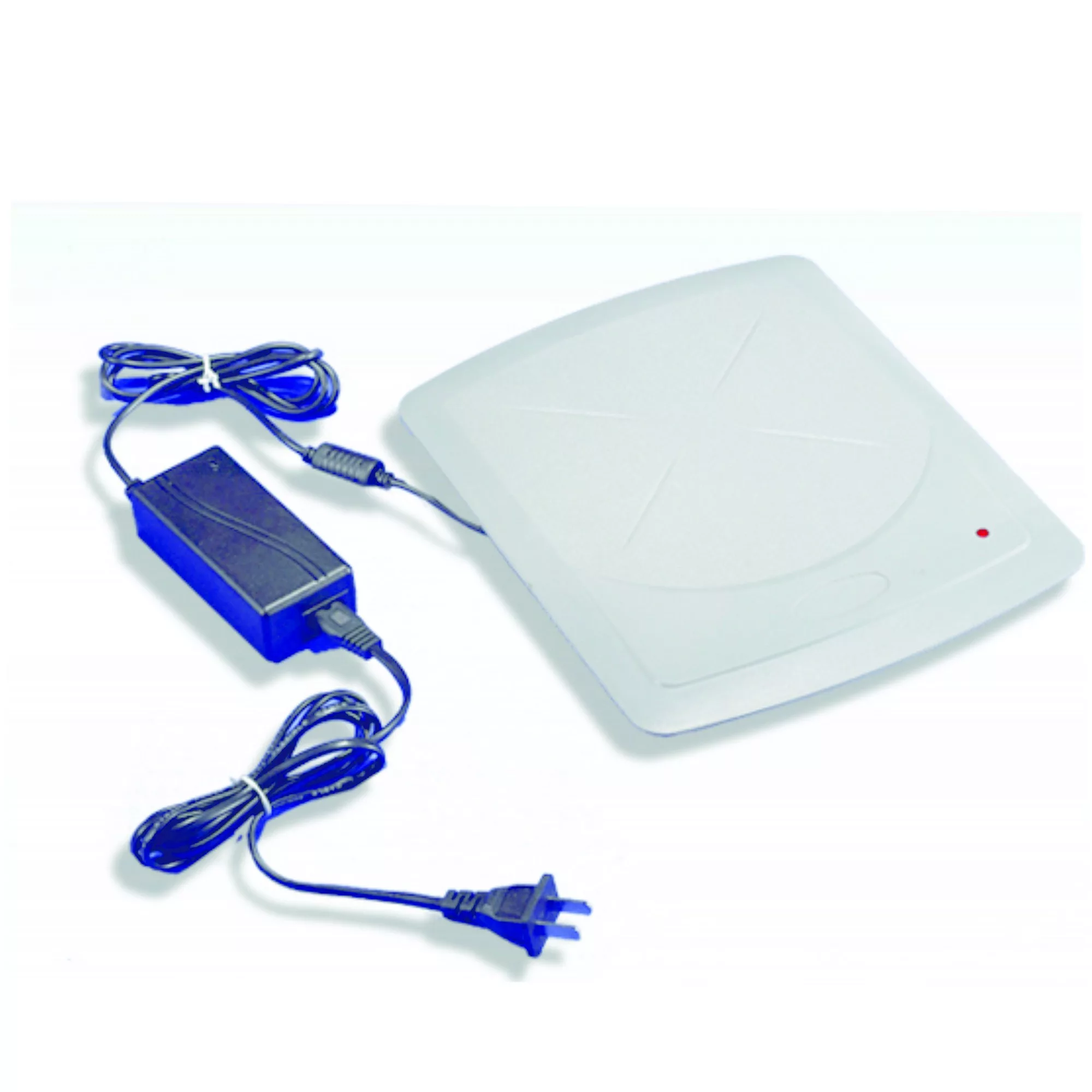 Desactivador electrónico empotrable con fuente de alimentación para etiquetas adhesivas de sistema RF. Color gris claro.