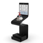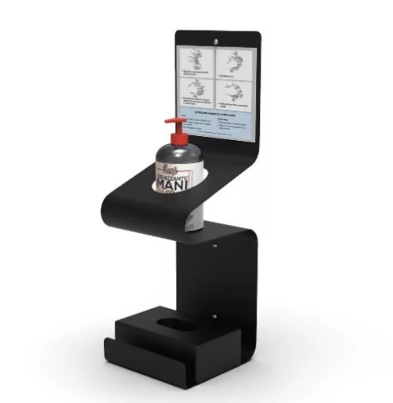 Dispensador metálico en color negro. Se puede poner en la pared o sobremesa, con portacartel. Dispone de bandeja integrada.