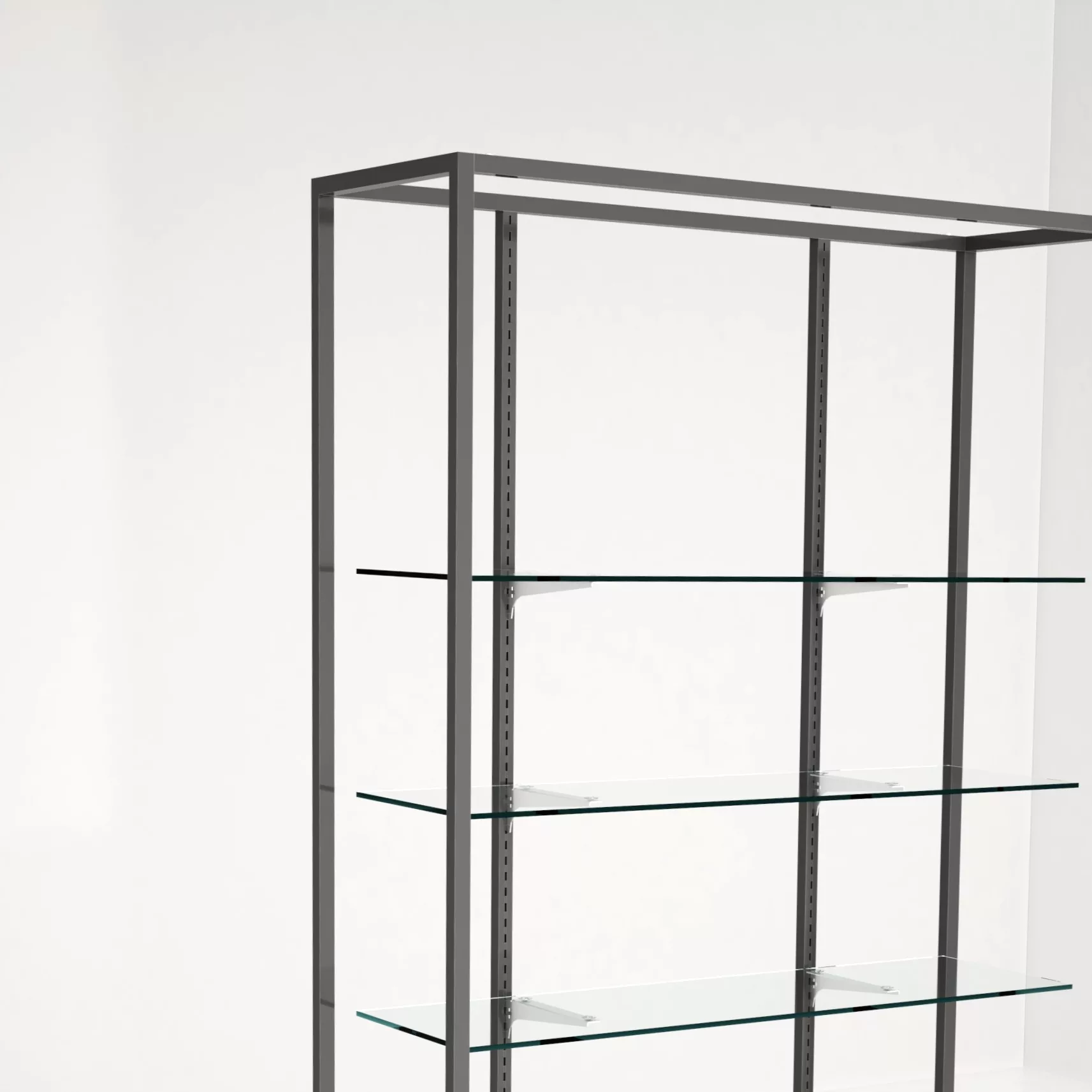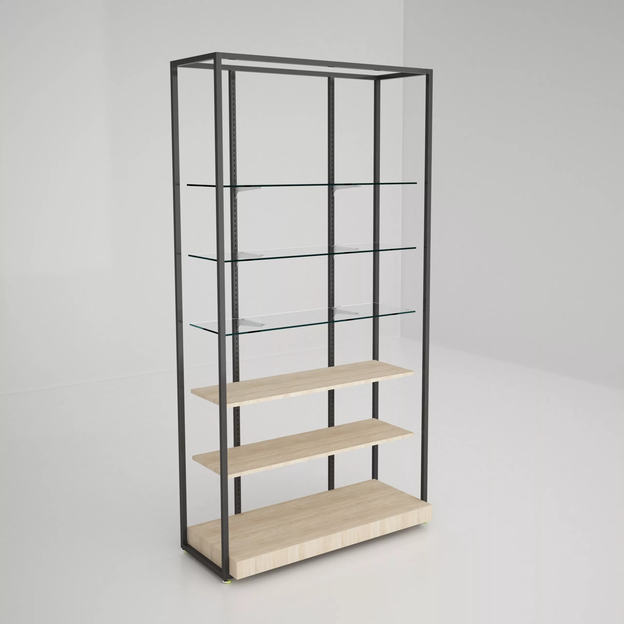 Estantería Modular SQ con estantes cristal, estantes madera y tarima (Tubo Cuadrado25mm)