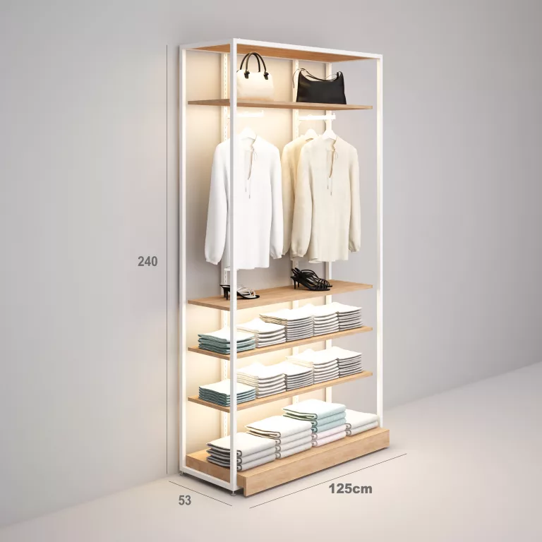 Confección Estantería Modular SQ con estantes madera iluminados, percheros, y tarima (Tubo Cuadrado25mm)