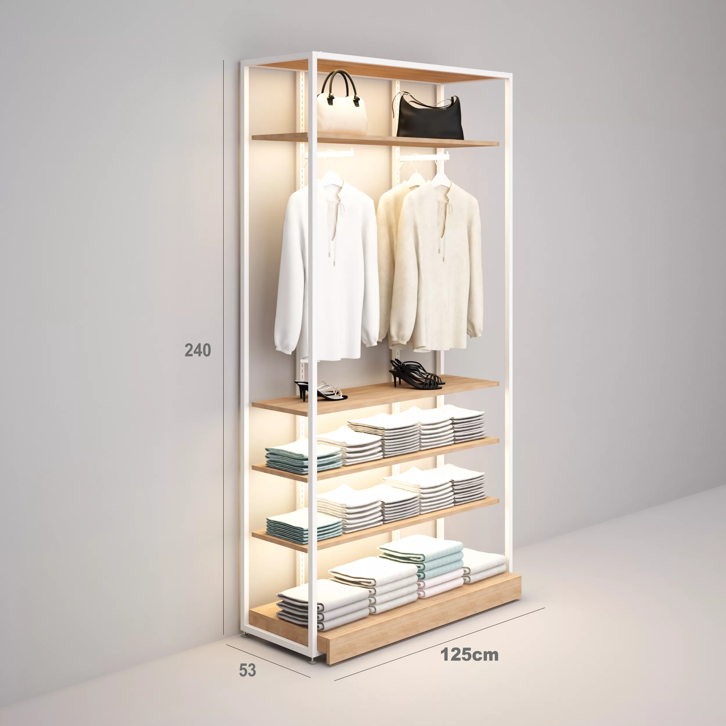 Estantería Modular SQ con percheros, estante iluminados 120x35cm y tarima (Tubo Cuadrado25mm)