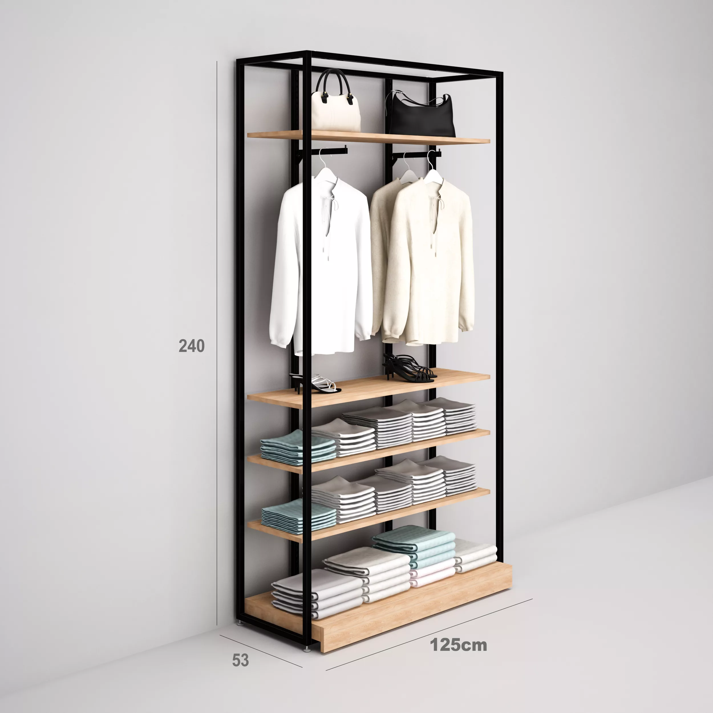 Estantería Modular SQ con percheros, estantes madera y tarima (Tubo Cuadrado25mm)