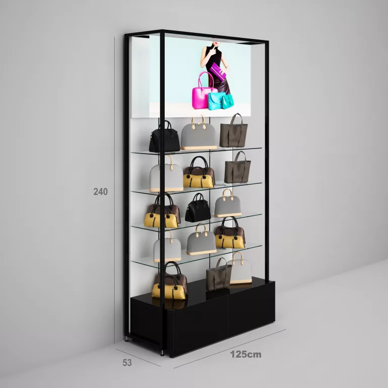DP-303 Estantería Modular SQ con estantes cristal, fondo liso, cajonera y visual Led (Tubo Cuadrado25mm)