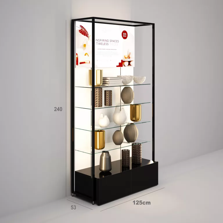 Estantería Modular SQ con estantes de cristal, cajonera y visual led (Tubo Cuadrado25mm)