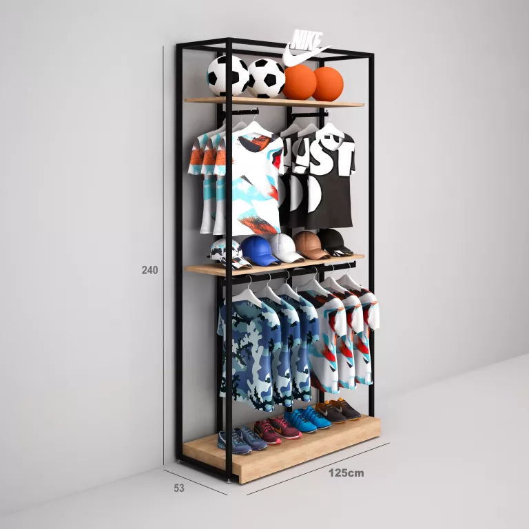 Deportes Estantería Modular SQ con estantes de madera, percheros y tarima (Tubo Cuadrado25mm)