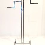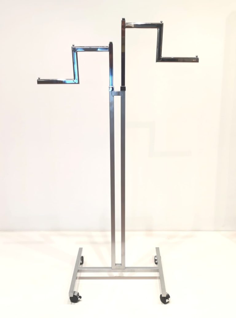 Expositor confección con pie en color gris pintado con 2 brazos en escalera cromados. Base de 95x95cm.