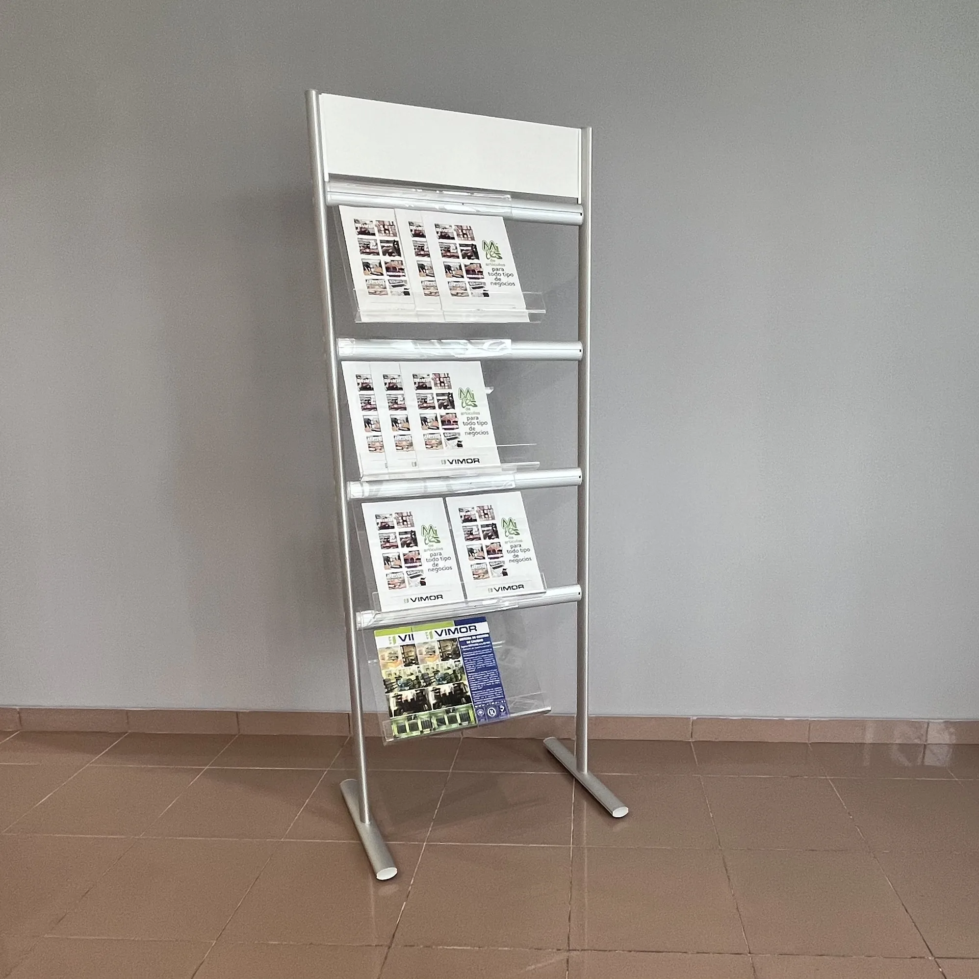 Expositor portafolletos con 4 estantes transparentes y posibilidad de añadir accesorio para cartelería