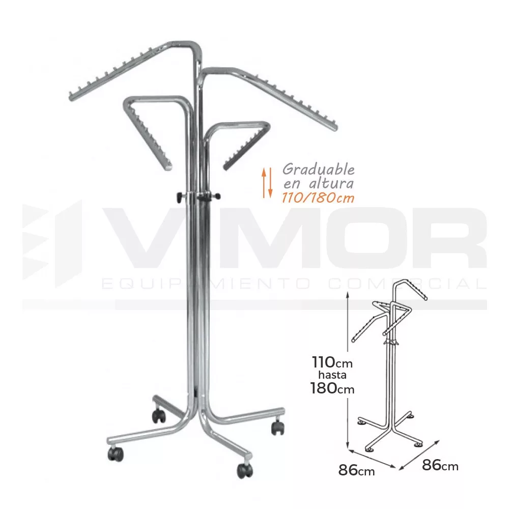 Expositor aspa 4 brazos inclinados ajustables, ruedas 50mm. cromado