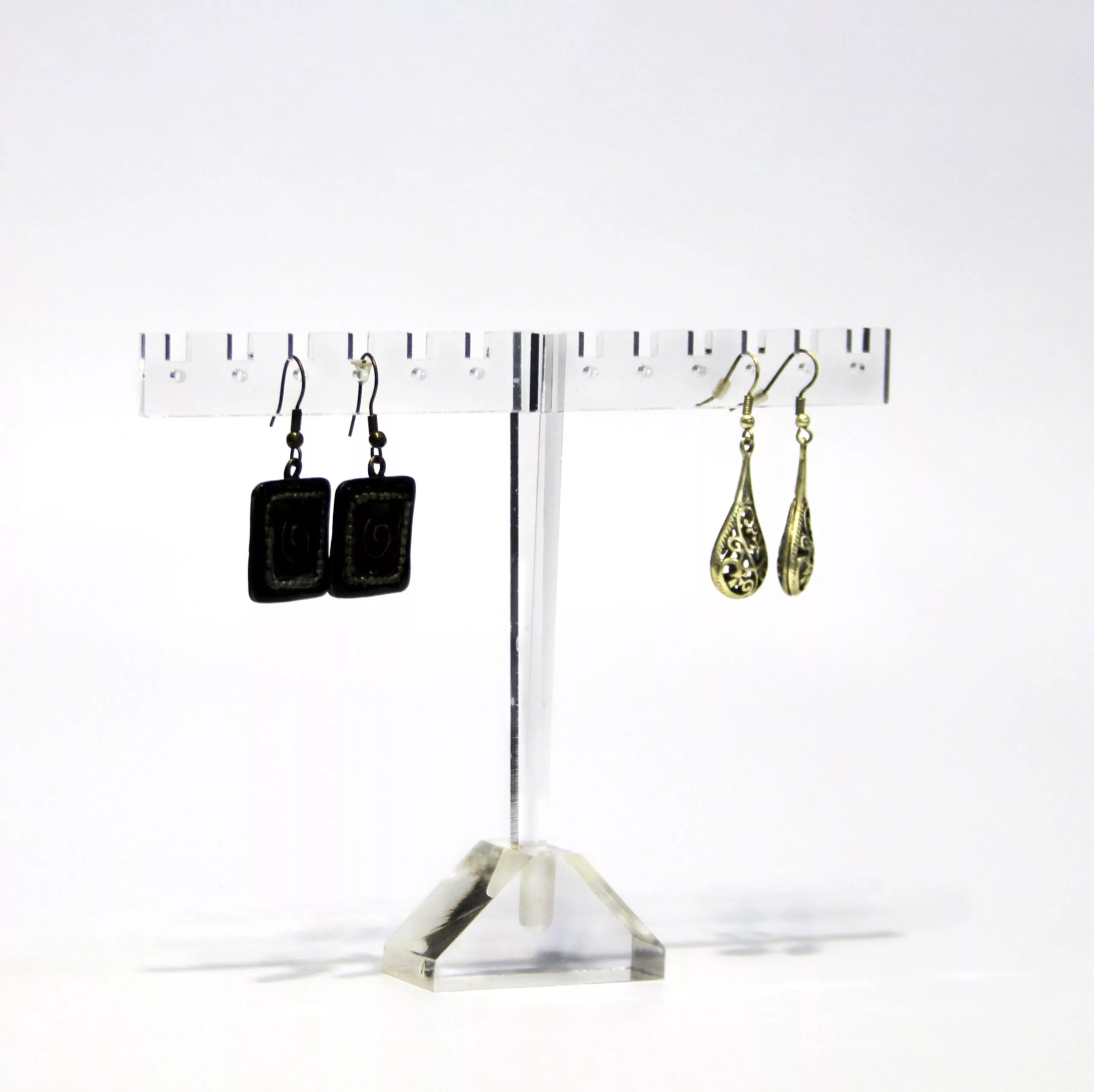 Expositor de metacrilato para bisutería. Barra superior preparada para pendientes o pequeñas cadenas. Color transparente.