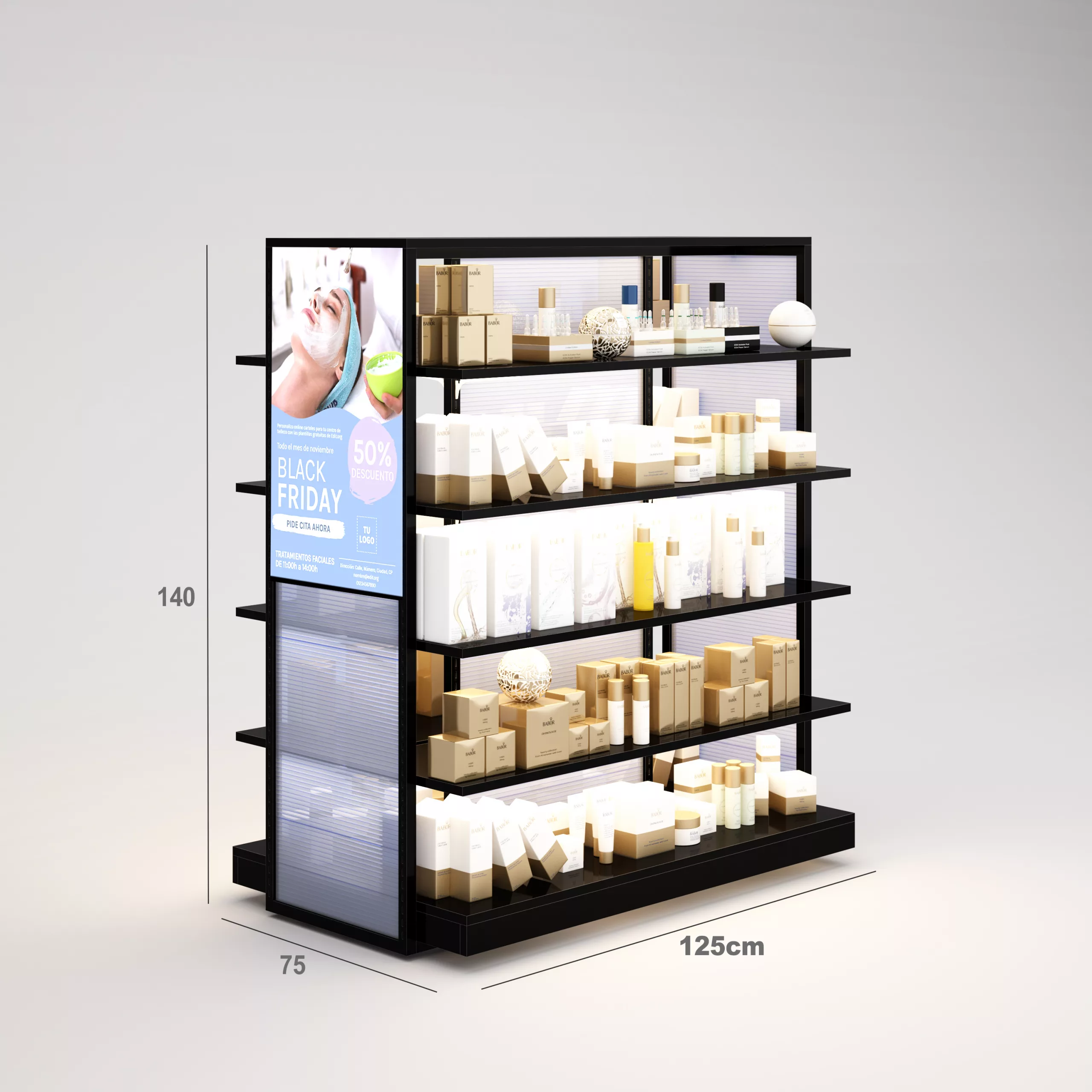 Farmacia Góndola SQ, estantes de madera con iluminación led, fondo policarbonato y Tarima (Tubo Cuadrado25mm)