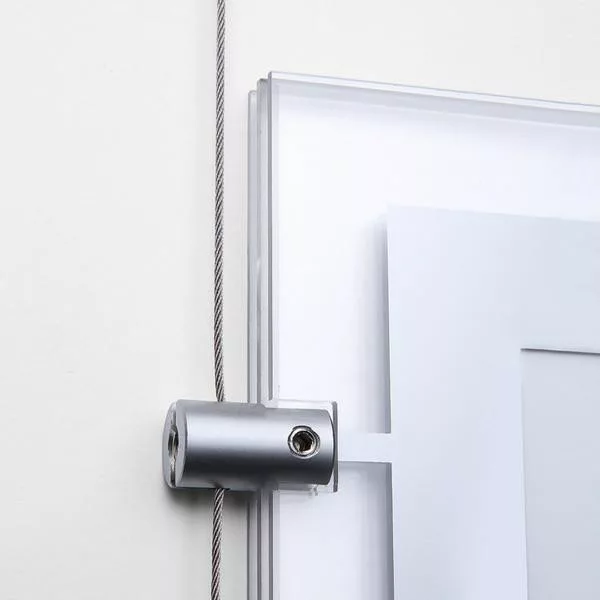 Grapa para sujeción simple de portacartel en sistema cable de máximo 4mm de grosor . Color cromado.