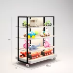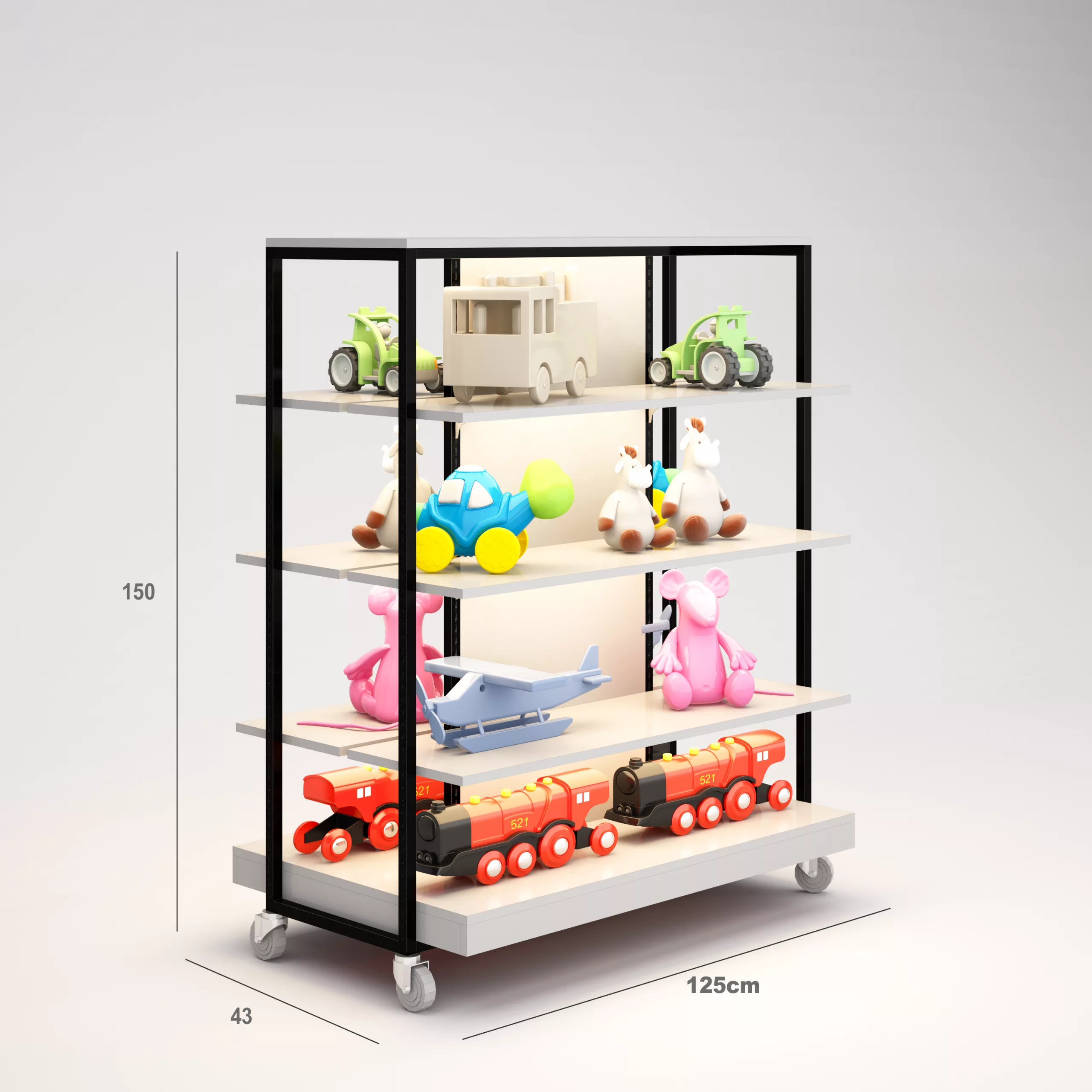 Juguetes Góndola Terraza SQ, estantes de madera con iluminación led, fondo liso y Tarima (Tubo Cuadrado25mm)