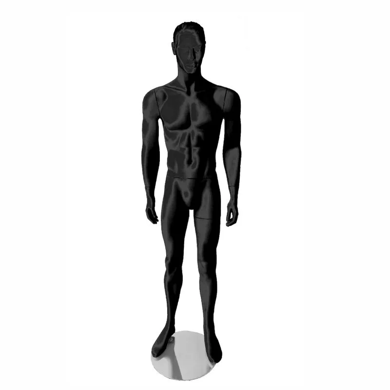 Maniquí caballero de fibra con cabeza, pelo esculpido . Base cromada con dos enganches a talón y pantorrilla. Color negro mate.