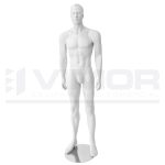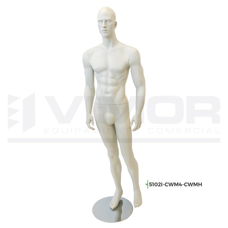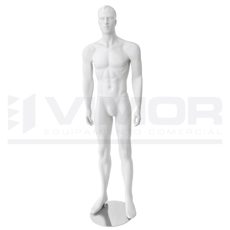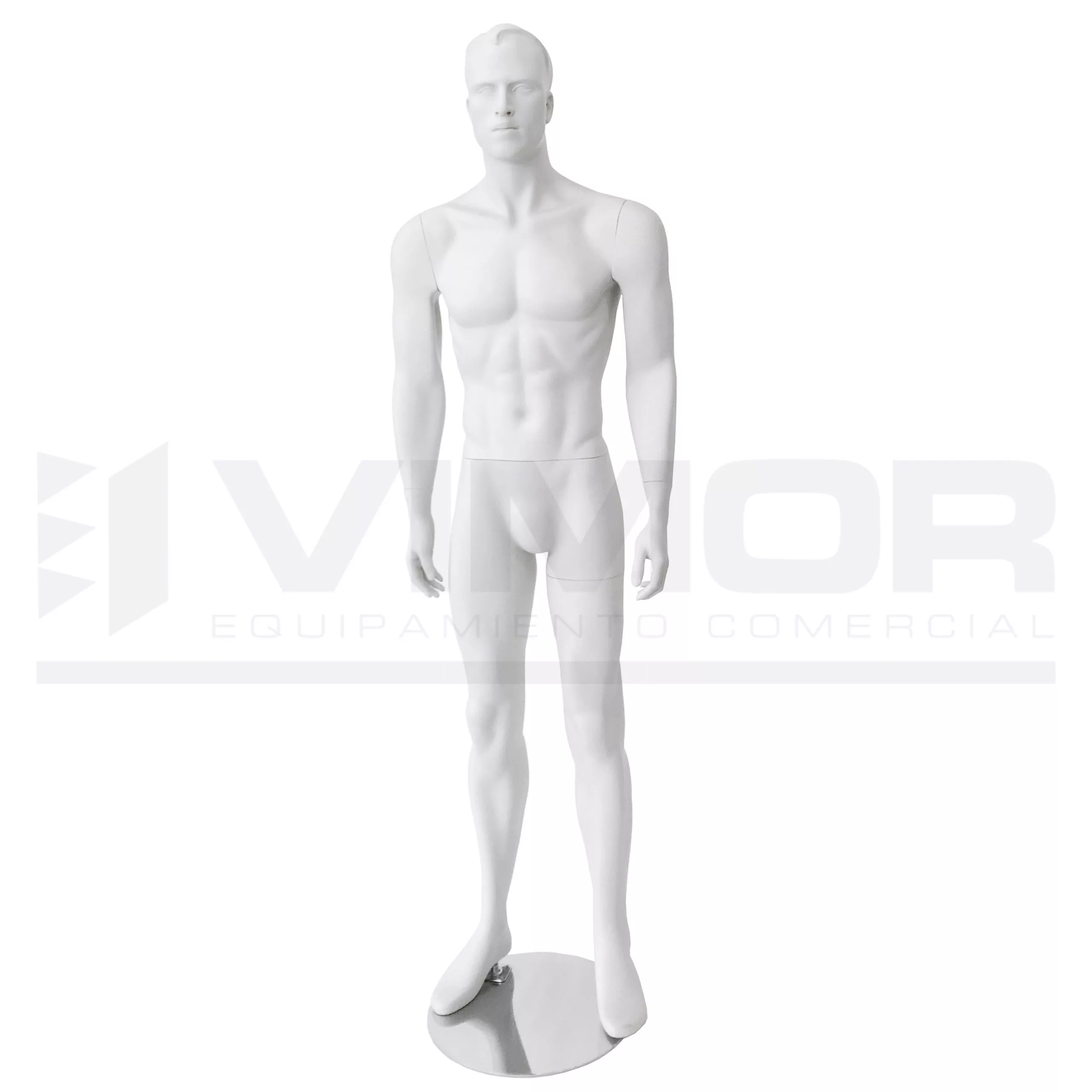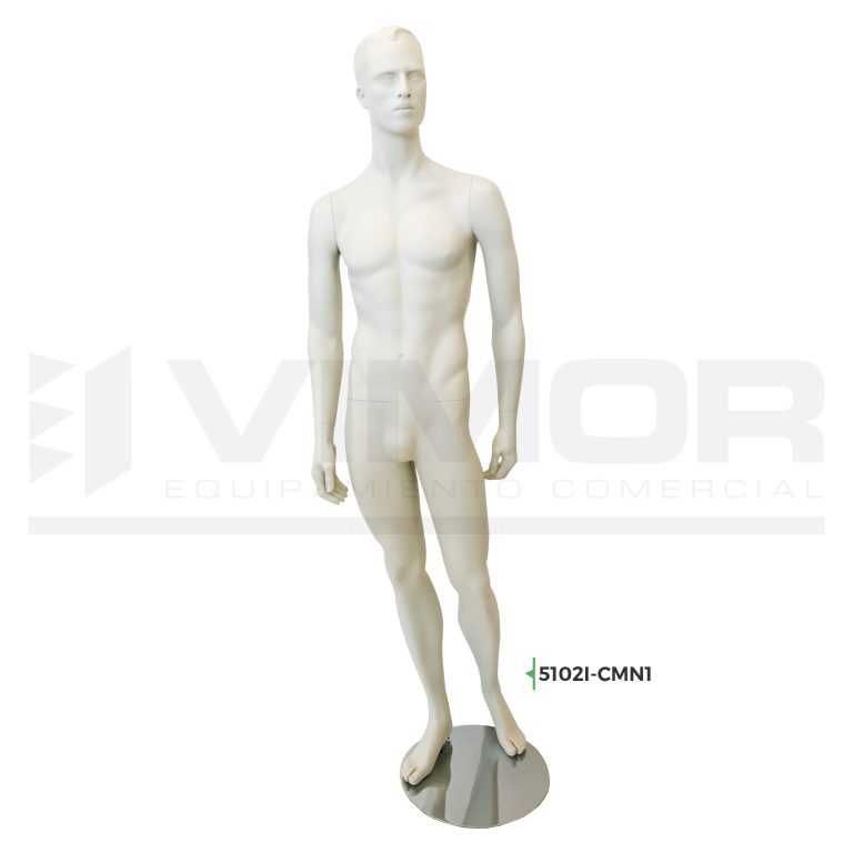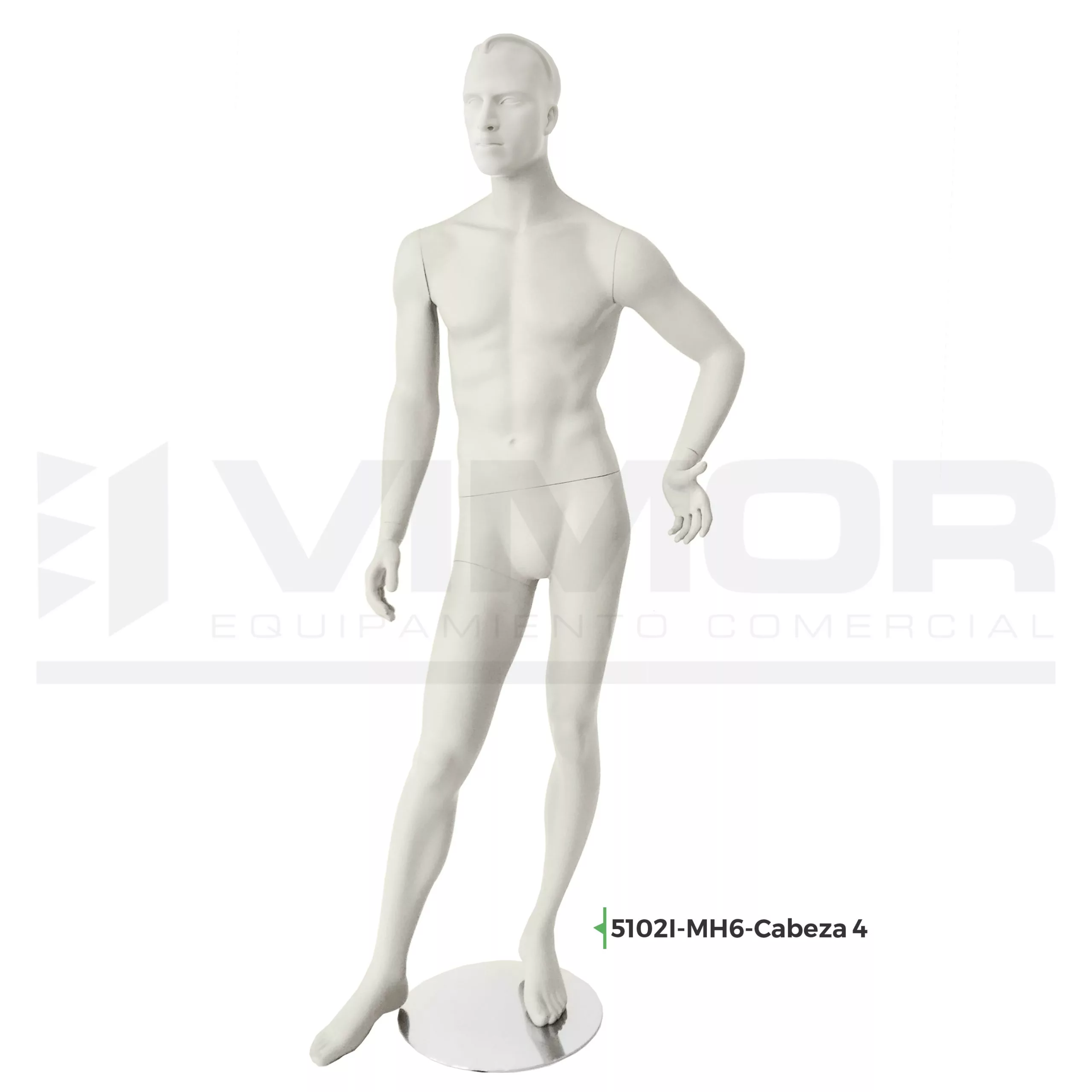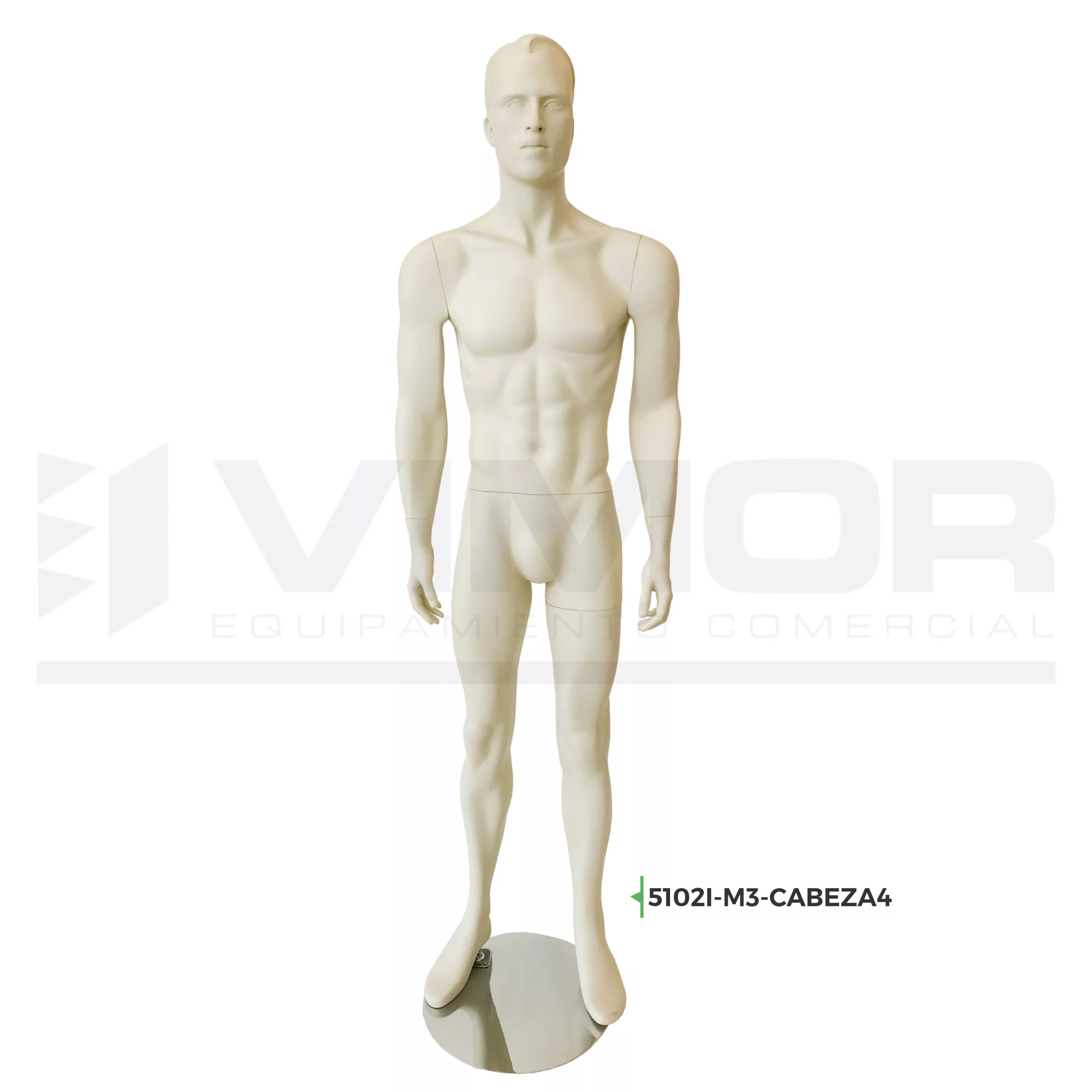 Maniquí caballero de fibra con cabeza y pelo esculpido. Base cromada con dos enganches a talón y pantorrilla. Color ivory.