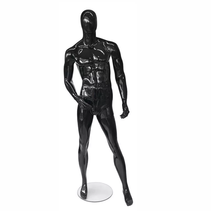 Maniquí caballero de fibra con cabeza sin rostro. Base cromada con dos enganches a talon y pantorrilla. Color negro brillo.