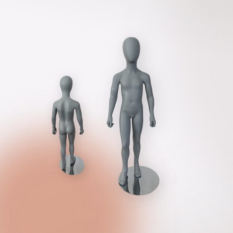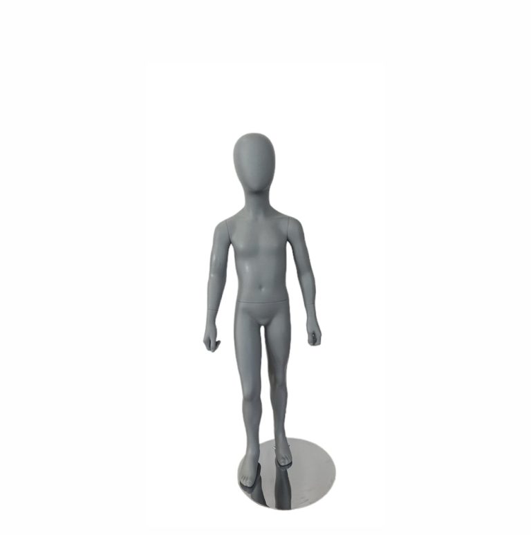 Maniquí infantil sin rostro color gris, sobre base de metal.