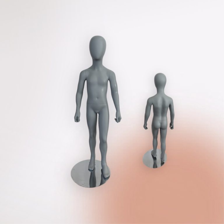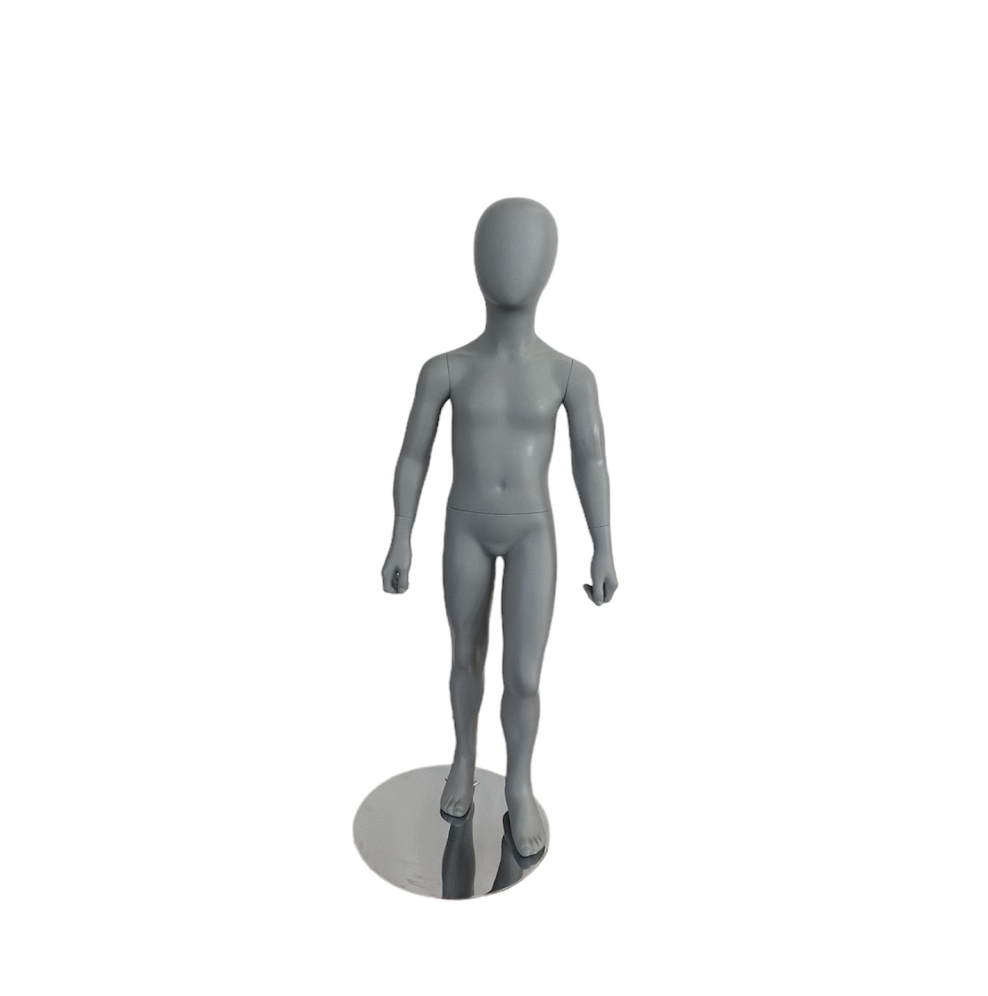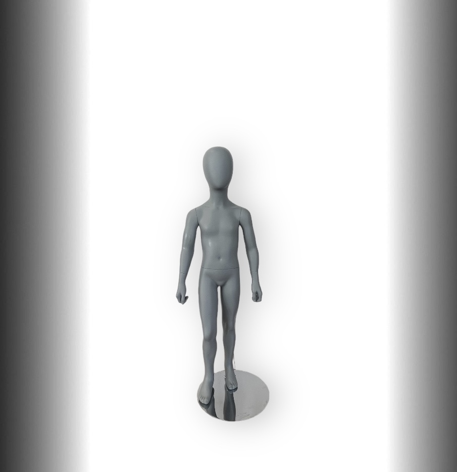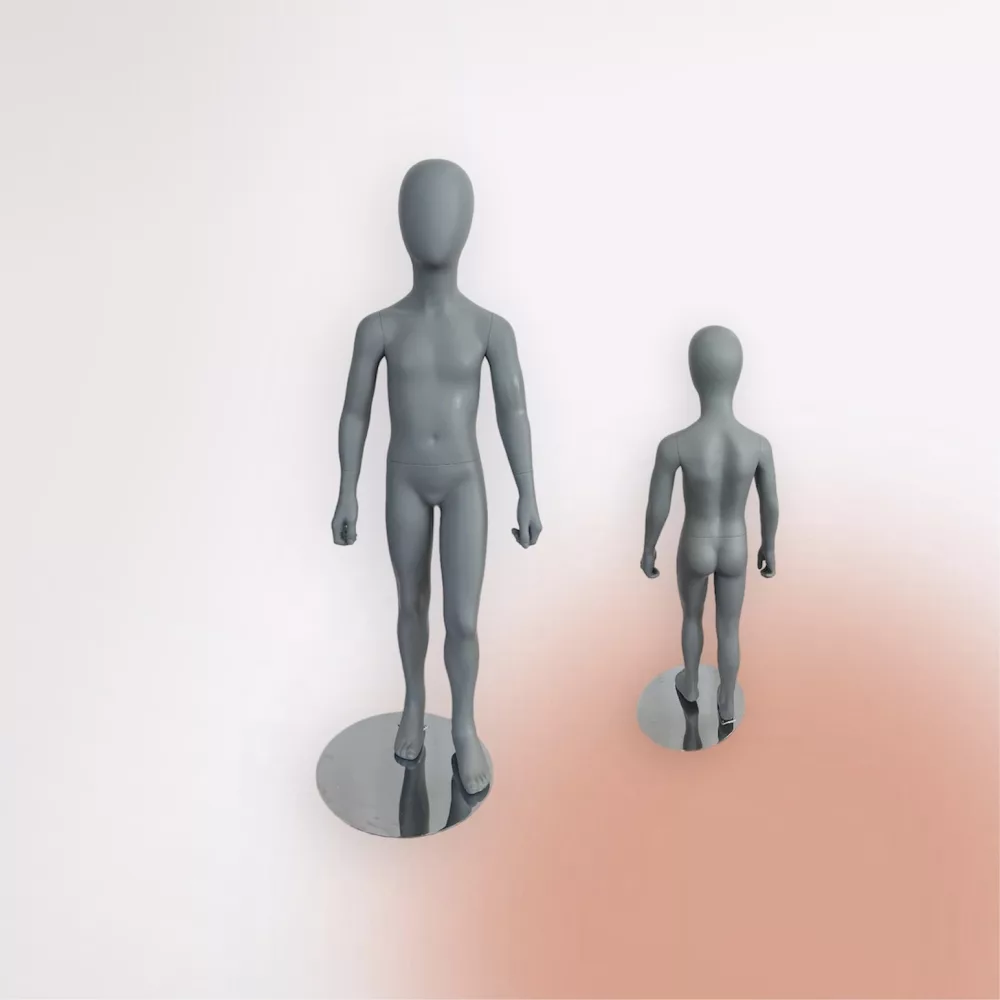 Maniquí infantil sin rostro color gris, sobre base de metal.