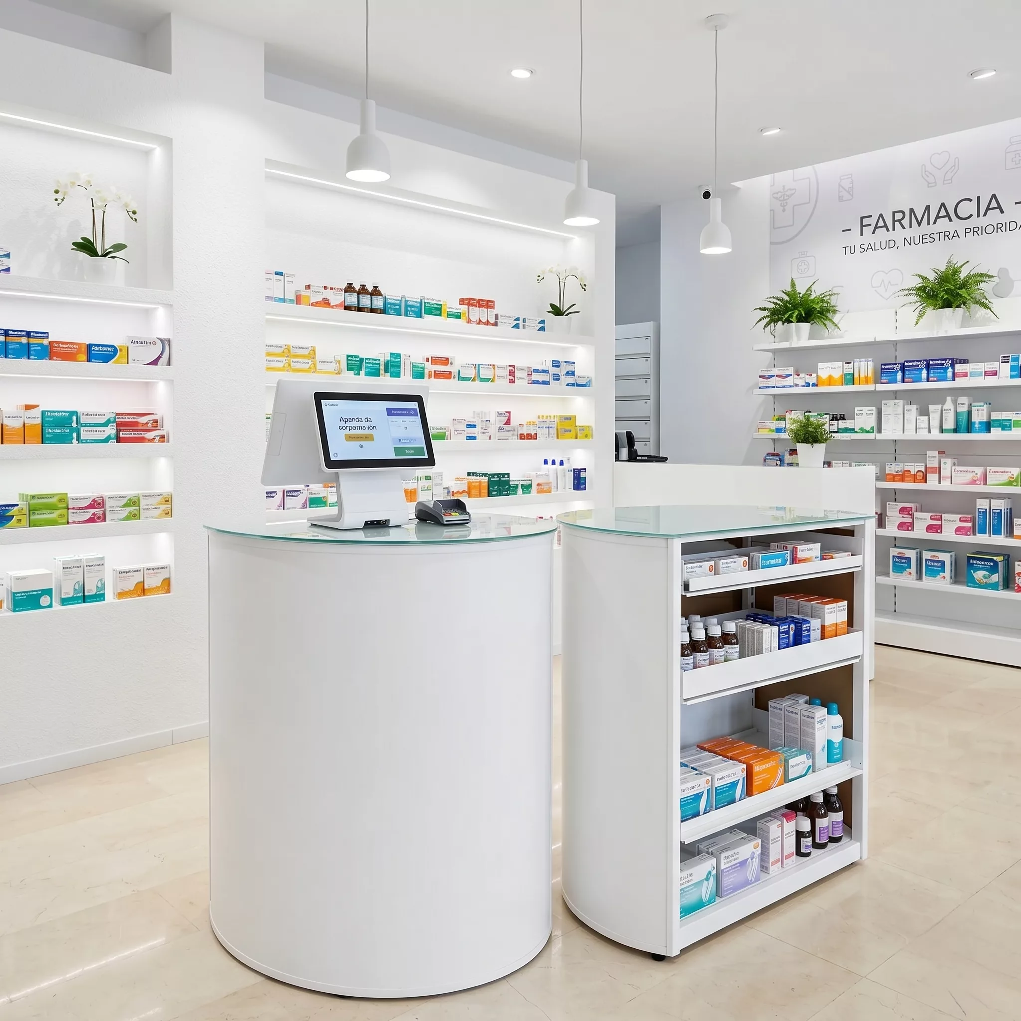 Mostrador caja curvo metálico y cristal, bandejas extraíbles 800x1030mm