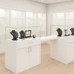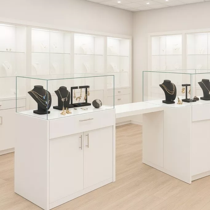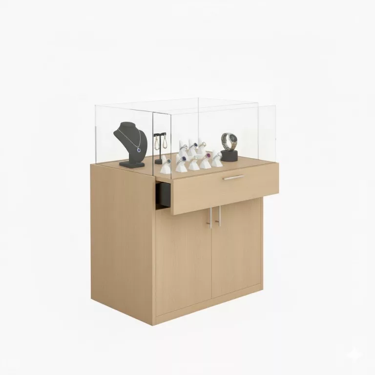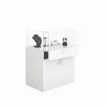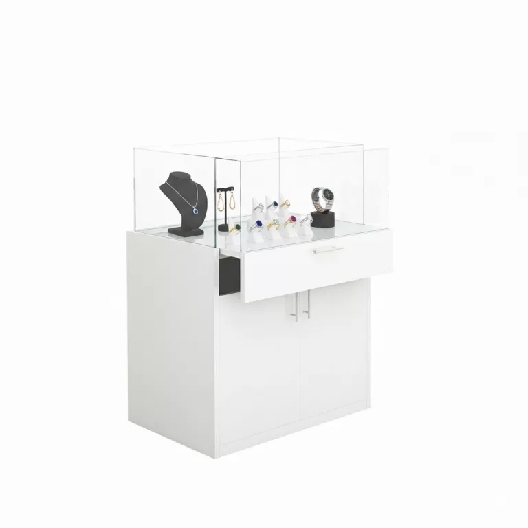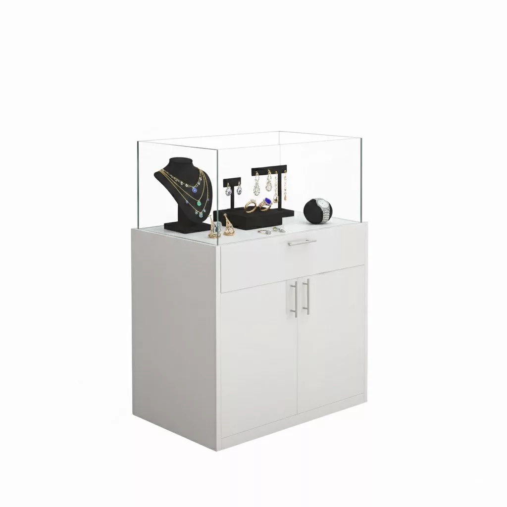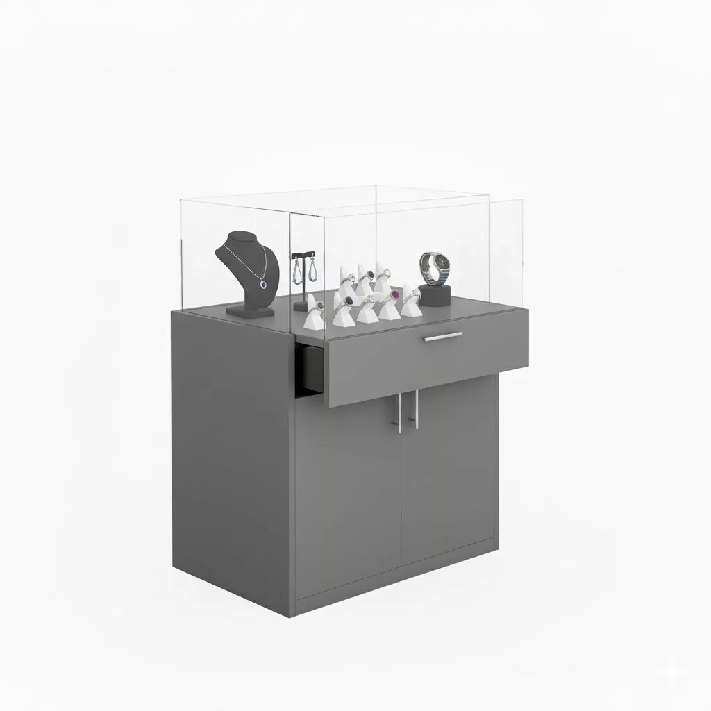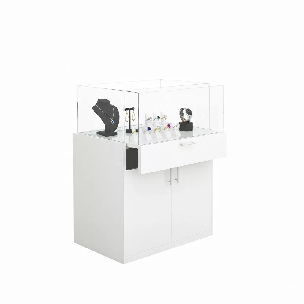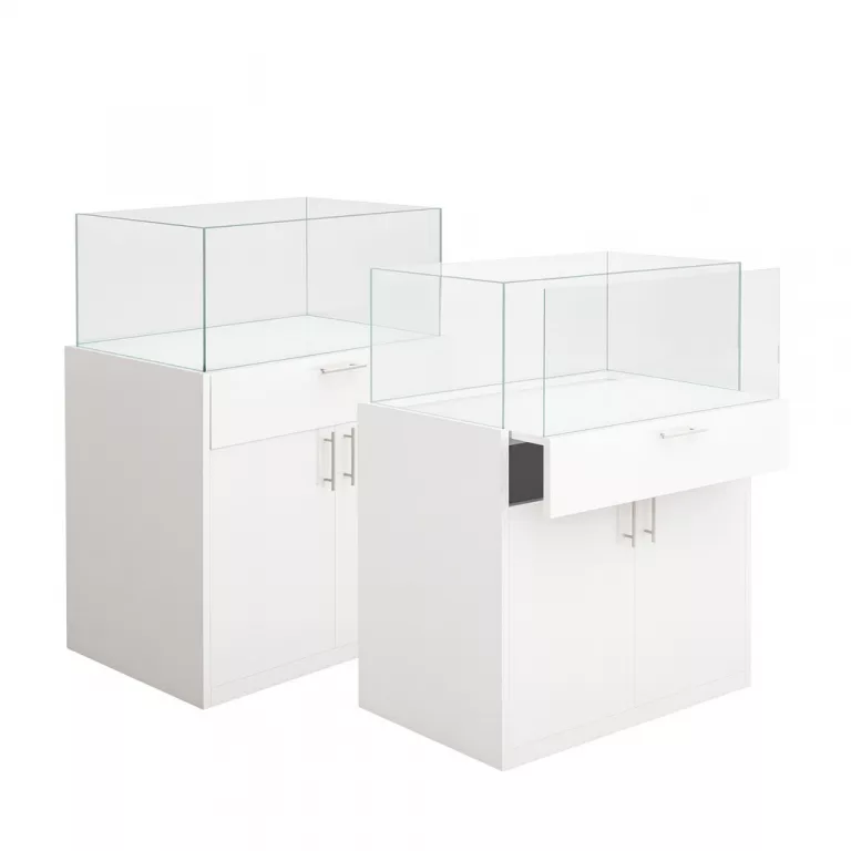 • Mostrador funcional y moderno,  que combina una vitrina de cristal segura para la presentación de productos con un espacio de almacenamiento cerrado en su base.