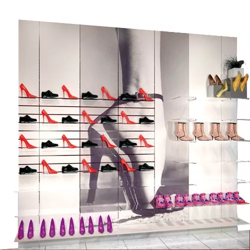 El sistema modular propone las soluciones más elegantes y adecuadas para tiendas de calzado, confección, complementos y deportes.