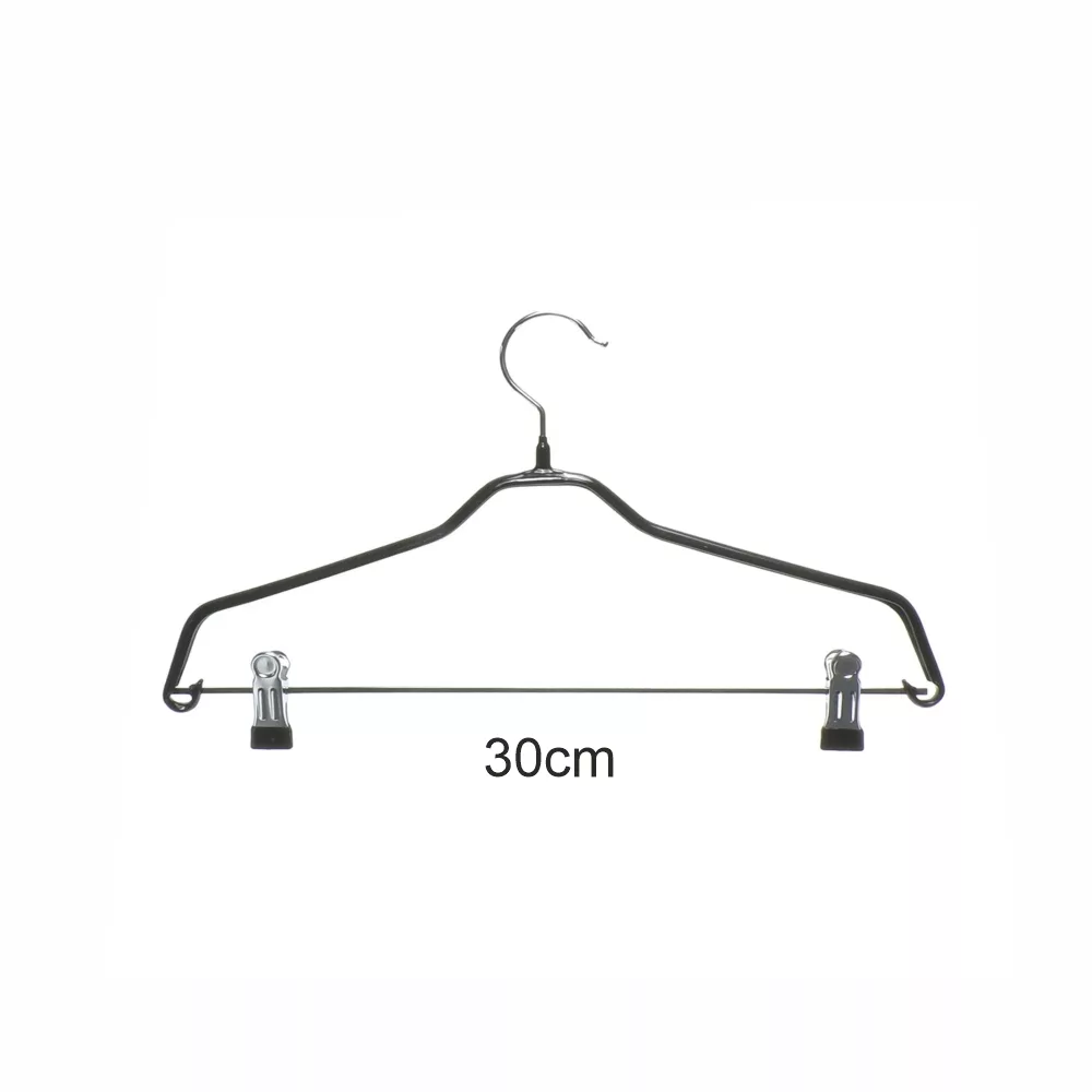 Percha antideslizante con pinzas. Ideal para conjuntos, camisas, pantalones, faldas infantil. 30cm de largo. Color negro.