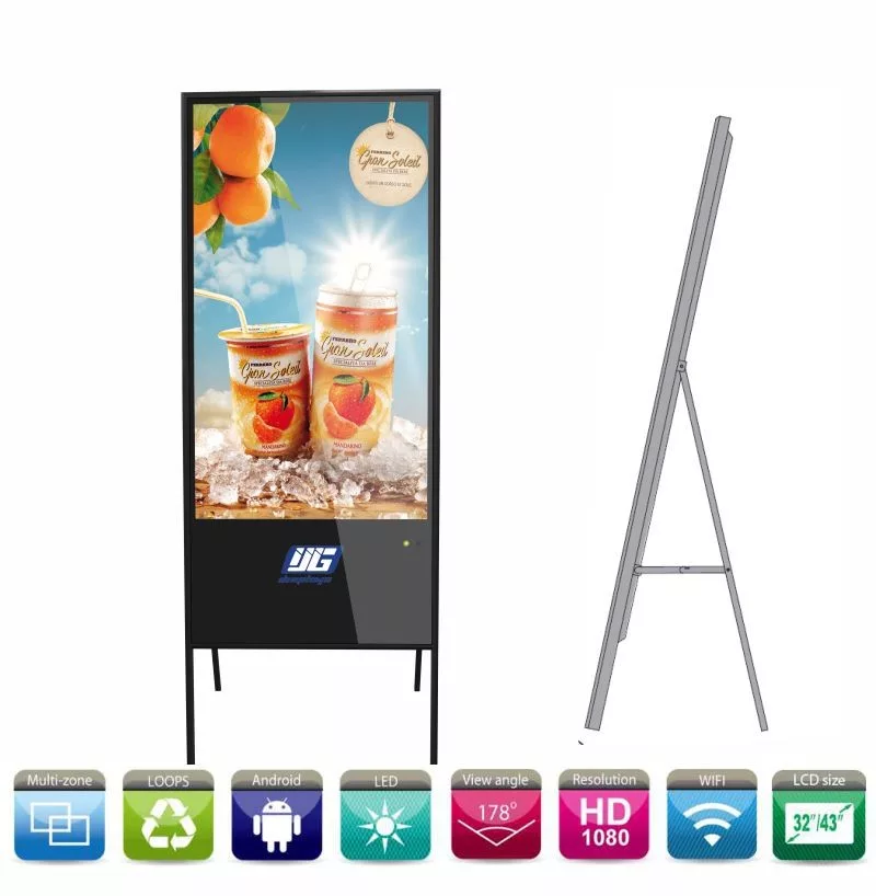 Pantalla LCD 43″ full HD de 43″, con marco negro y soporte metálico plegable en forma de tijera. Ligero, fácil de desplazar y programable por USB y WiFi. Basado en sistema Android, fácilmente configurable y escalable con las aplicaciones disponibles. Admite imagen y vídeo.