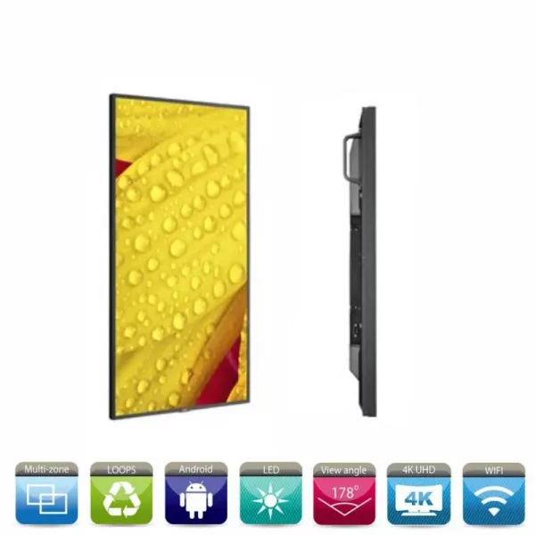 Pantalla LCD de pared con un moderno diseño de marco de borde estrecho, con tarjeta de señalización y potente tarjeta 4K integradas en el interior que permiten configurar el producto como la extensión de pantalla única o multipantalla. El producto permite al usuario tener cualquier uso en planta de combinación de pared con un máximo de 15 pantallas al mismo tiempo.