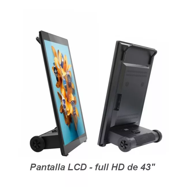 Pantalla LCD 43″ full HD de 43″, con marco negro y soporte metálico plegable. Con 2 ruedas y asa, fácil de desplazar y programable por USB y WiFi. Basado en sistema Android 7.1, fácilmente configurable.