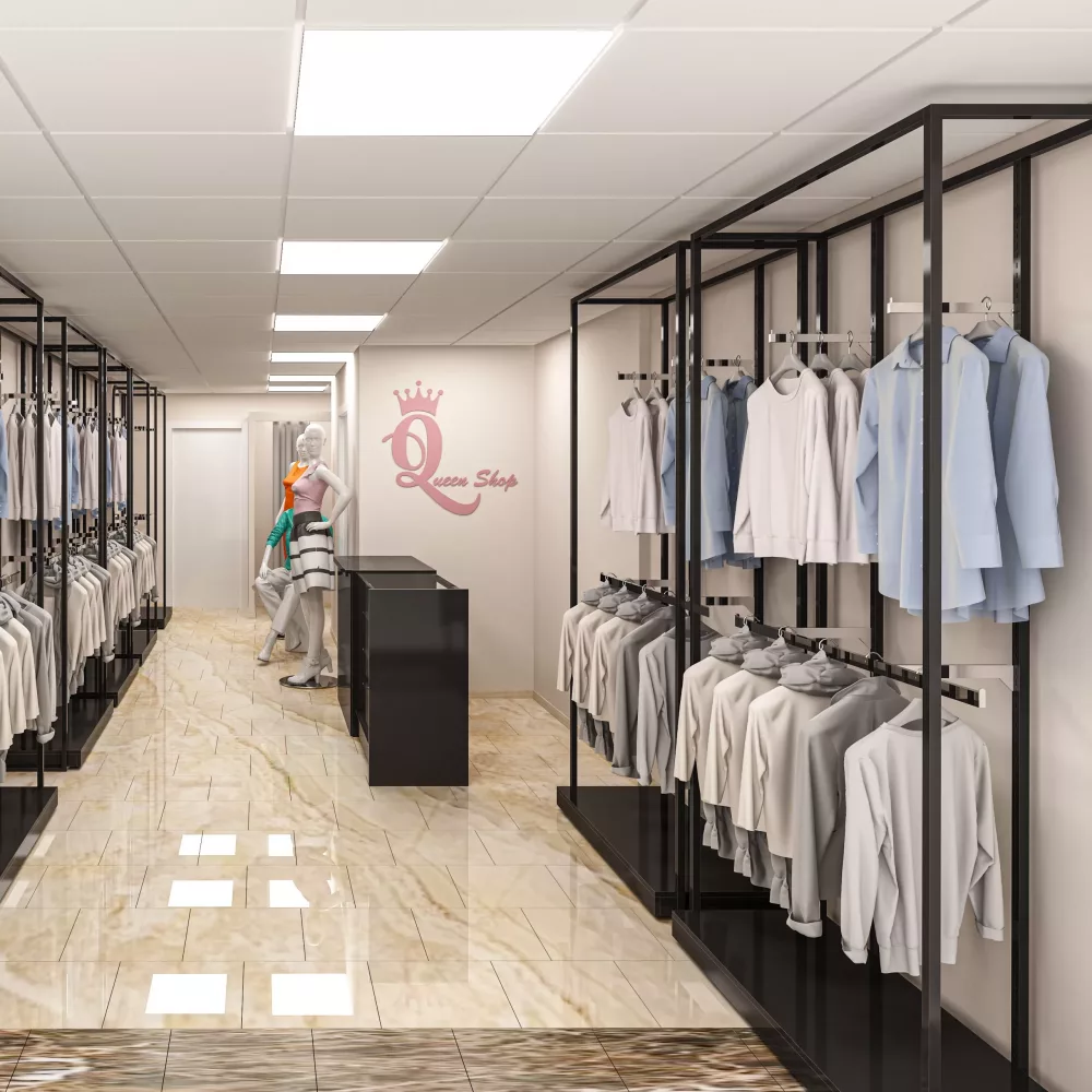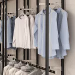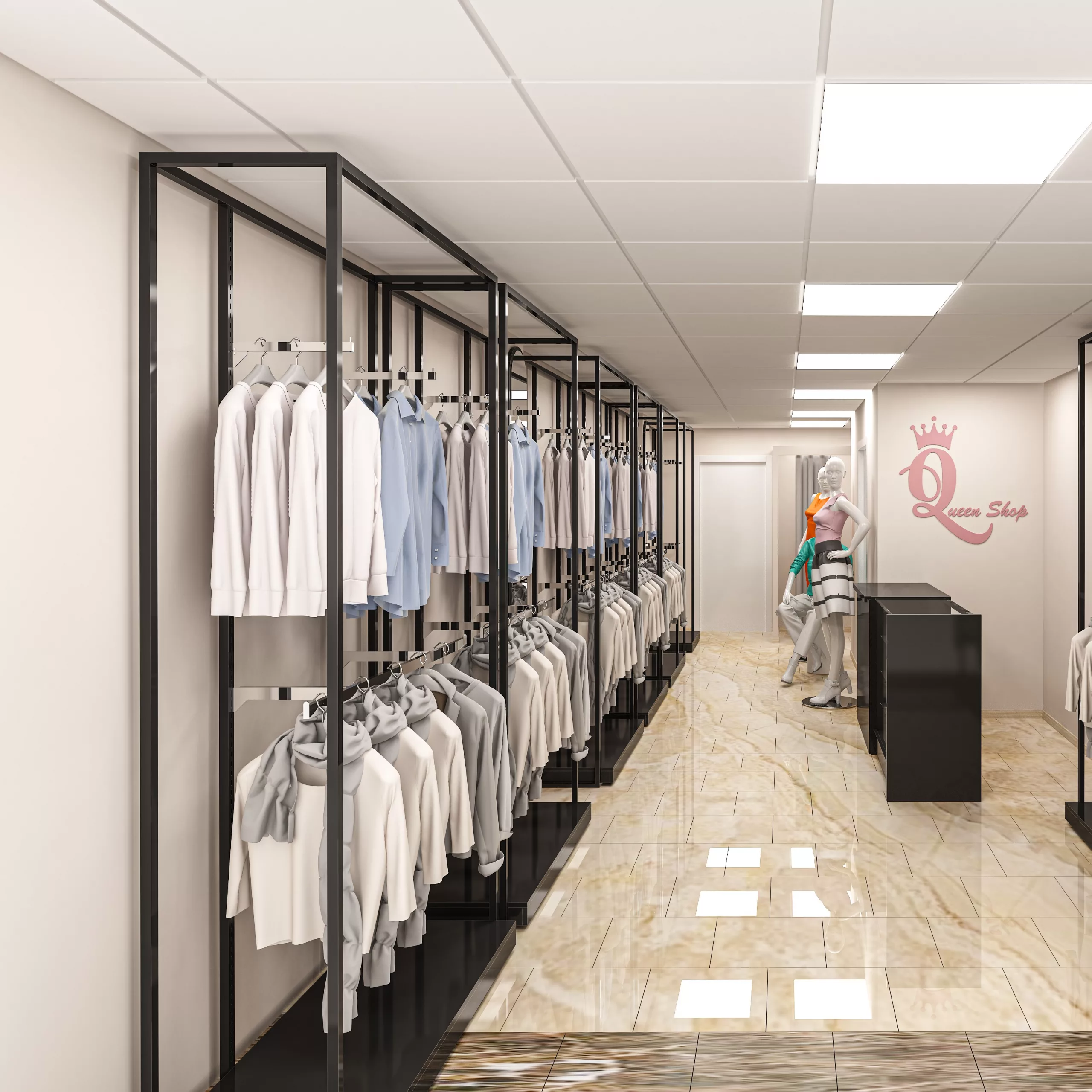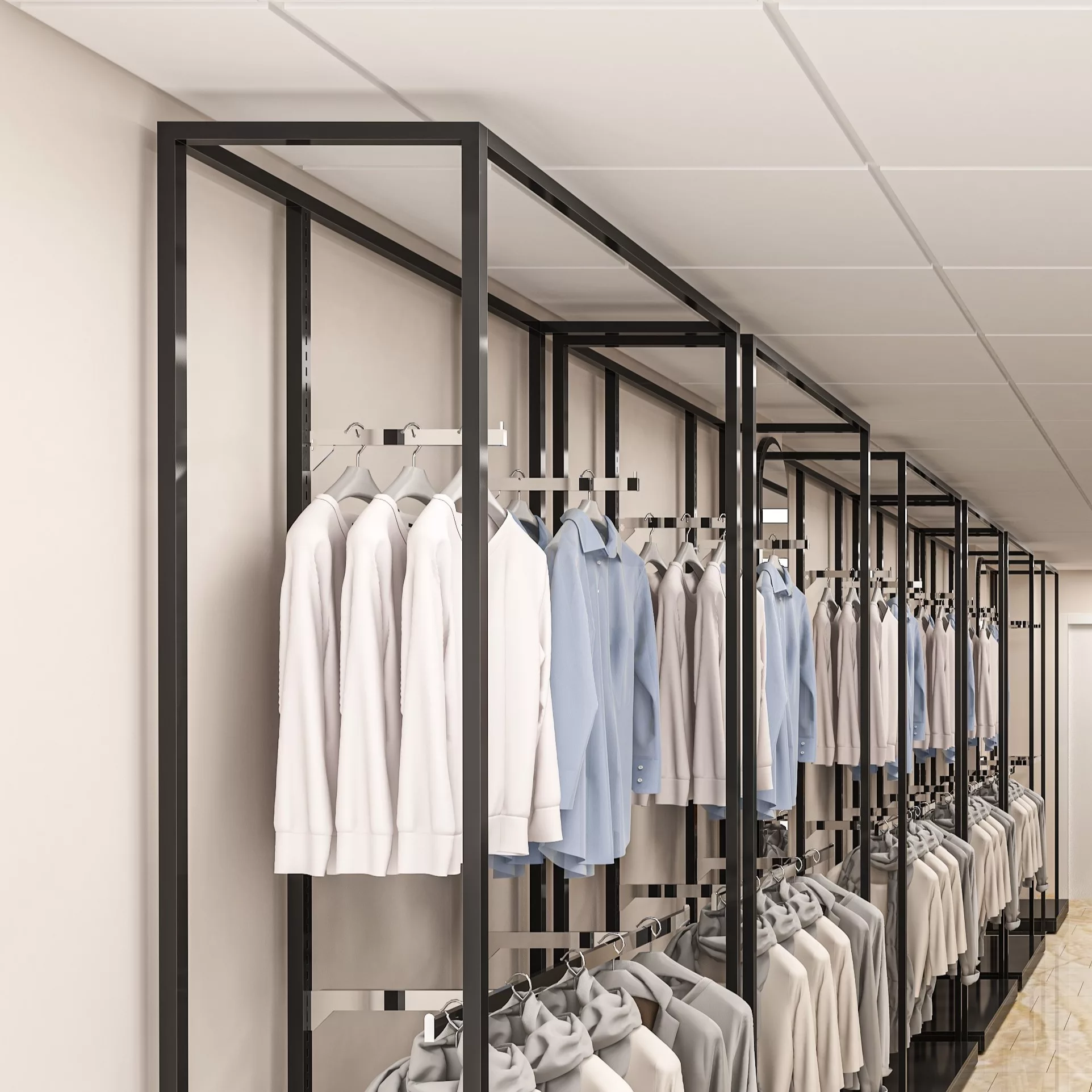 Pared con estantería Modular SQ negra con barras colgadoras y tarimas