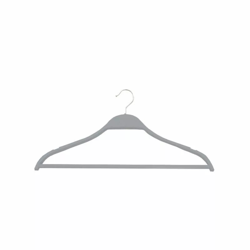 Percha ABS, para conjuntos con muescas para camisa, pantalón o falda. 45cm de largo. Color gris.